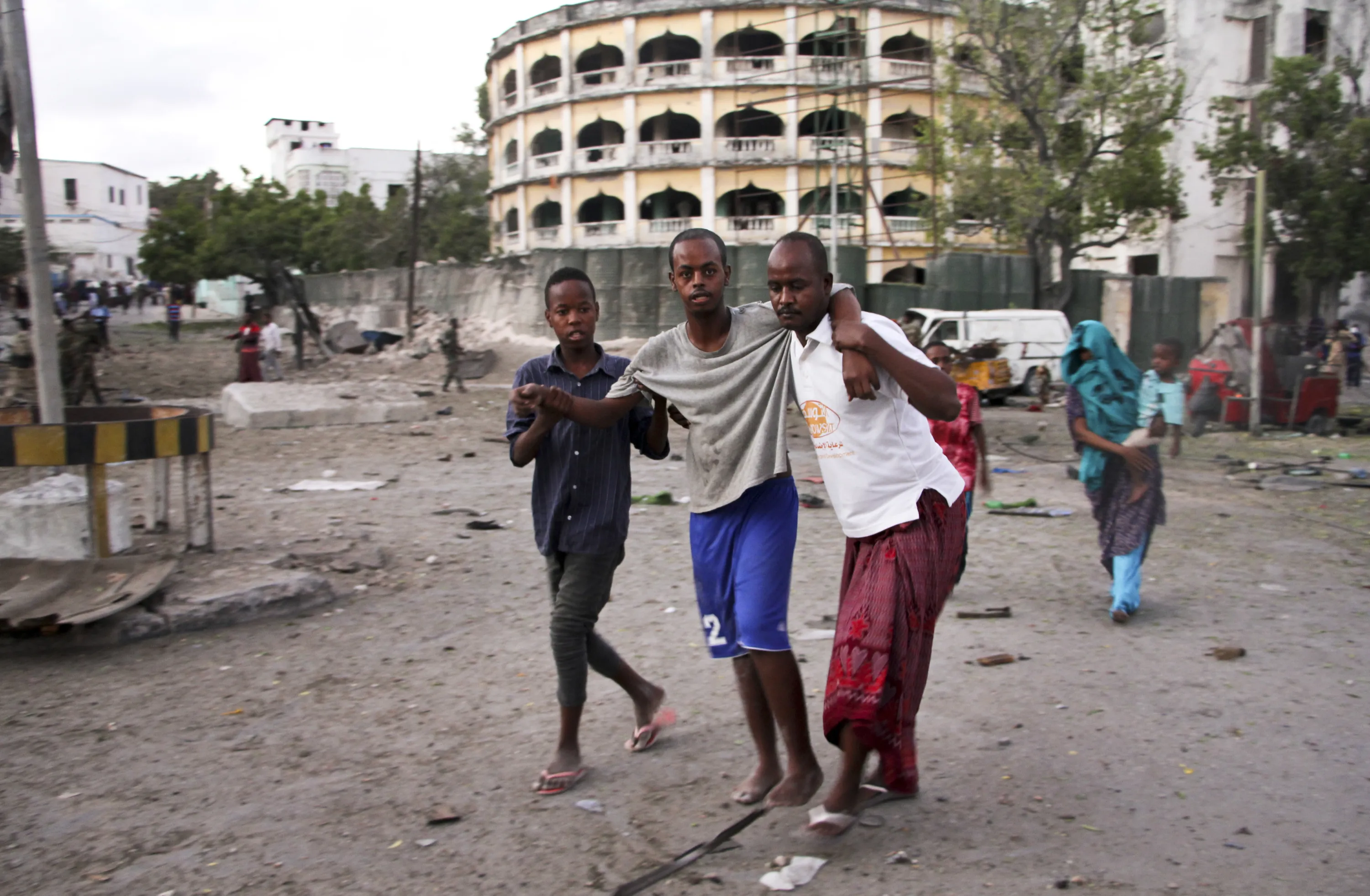 An injured man is assisted after a suicide car bomb attack that targeted a check point in Mogadishu, Somalia, Tuesday, March 21, 2017. The car bomb exploded Tuesday at a military checkpoint near Somalia's presidential palace in the capital after soldiers tried to stop the car and the bomber tried to speed through the checkpoint, killing a number of people, police said. (Photo by Farah Abdi Warsameh/AP Photo)