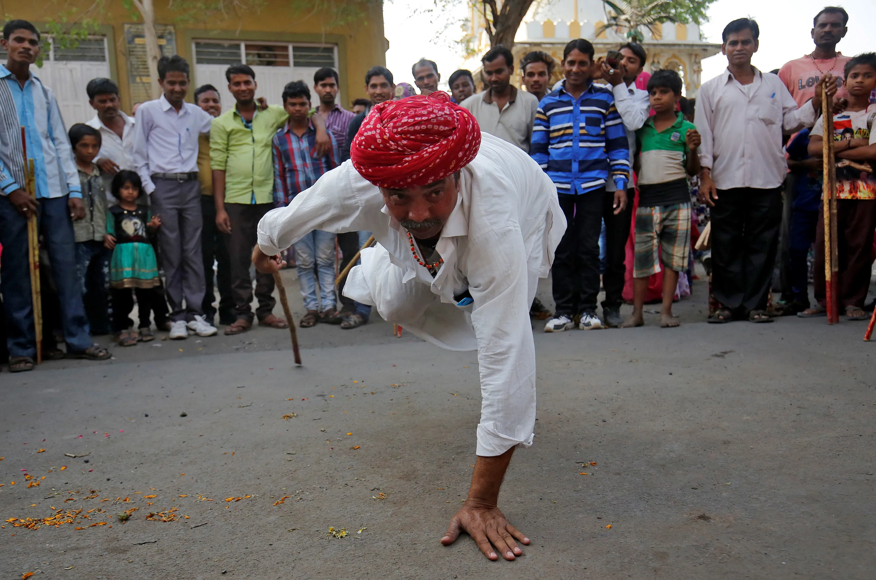 A man performs a stunt with a bamboo stick as part of Holi celebrations locally known as “Gare” festival outside a temple in Ahmedabad, March 19, 2017. (Photo by Amit Dave/Reuters)
