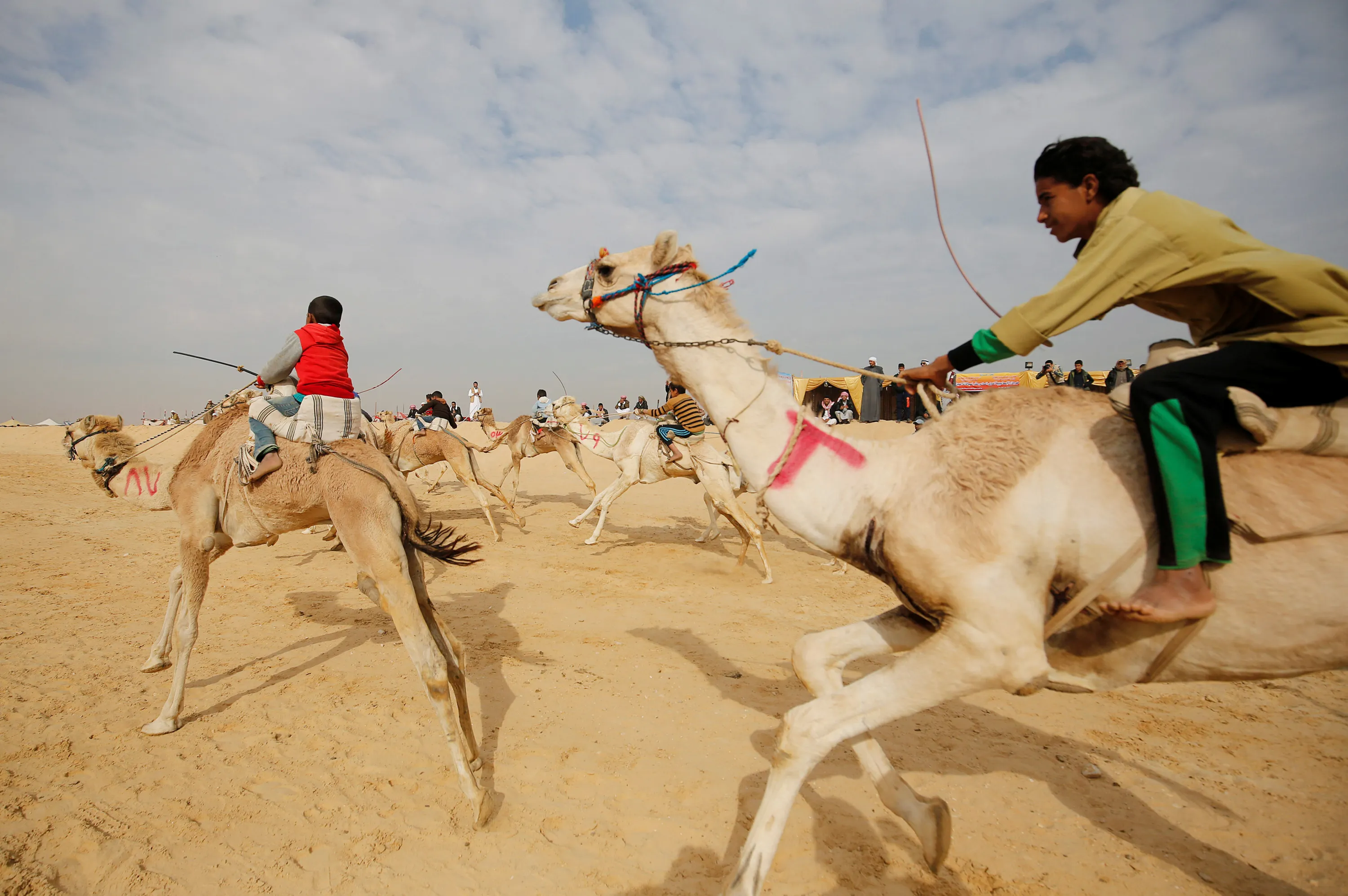 Jockeys, most of whom are children, compete on their mounts during the opening of the International Camel Racing festival at the Sarabium desert in Ismailia, Egypt, March 21, 2017. (Photo by Amr Abdallah Dalsh/Reuters)