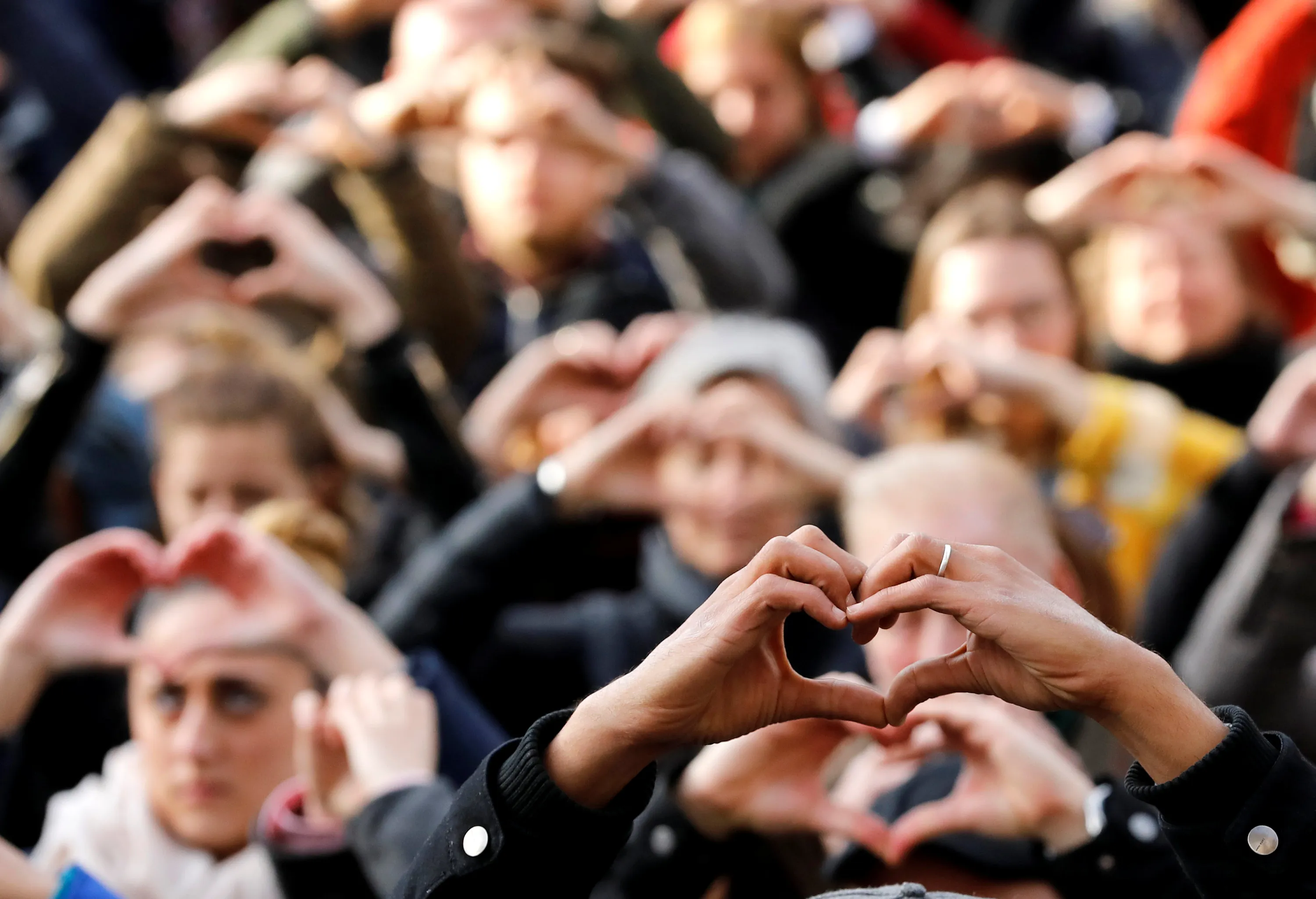 People make hearts with their fingers during a ceremony outside the Bourse, commemorating the first anniversary of the bomb attacks in Brussels metro and the Belgian international airport of Zaventem, in Brussels, Belgium, March 22, 2017. (Photo by Yves Herman/Reuters)