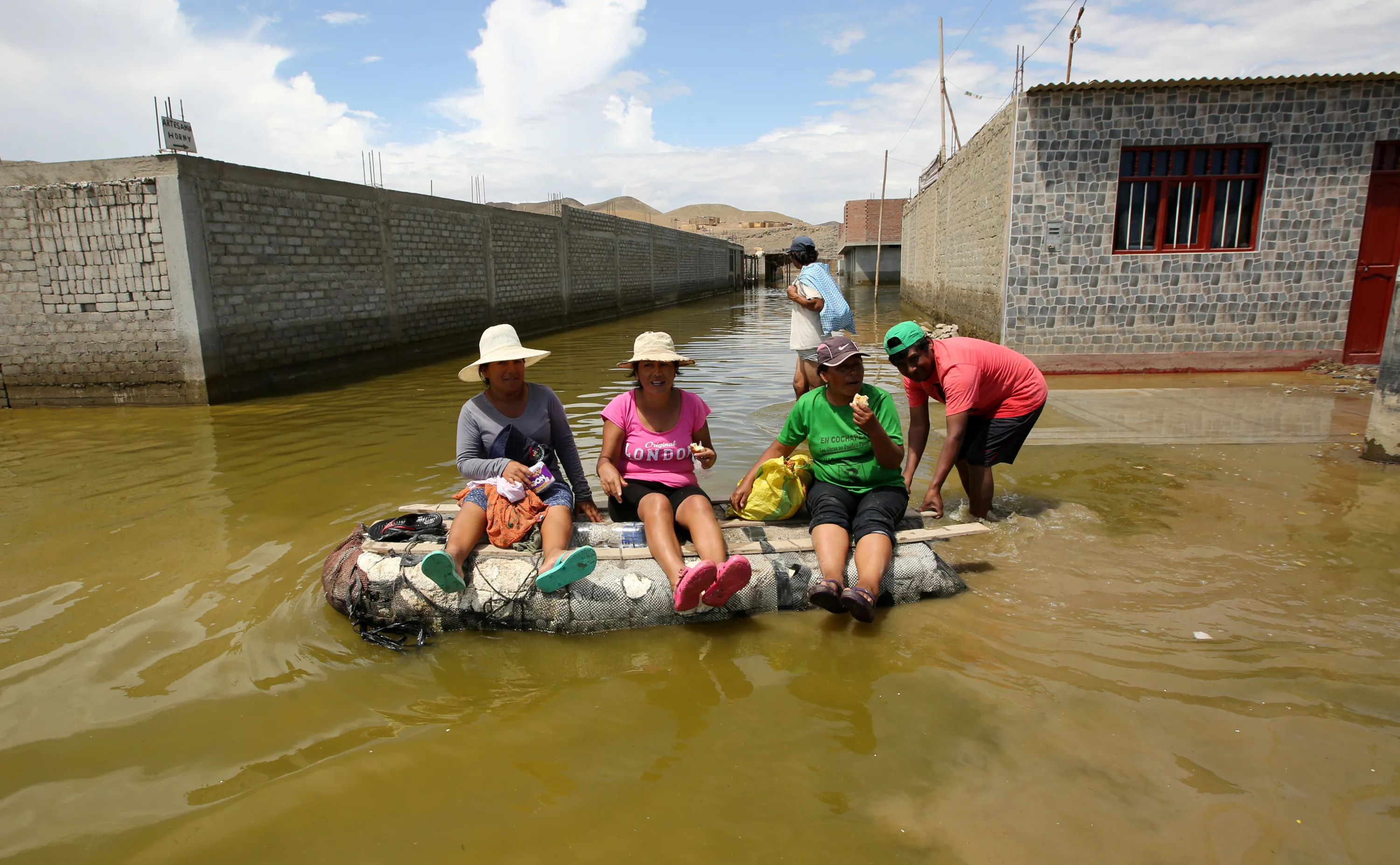 Residents use a raft to cross a flooded street , after rivers breached their banks due to torrential rains, causing flooding and widespread destruction in Huarmey, Ancash, Peru, March 22, 2017. (Photo by Mariana Bazo/Reuters)