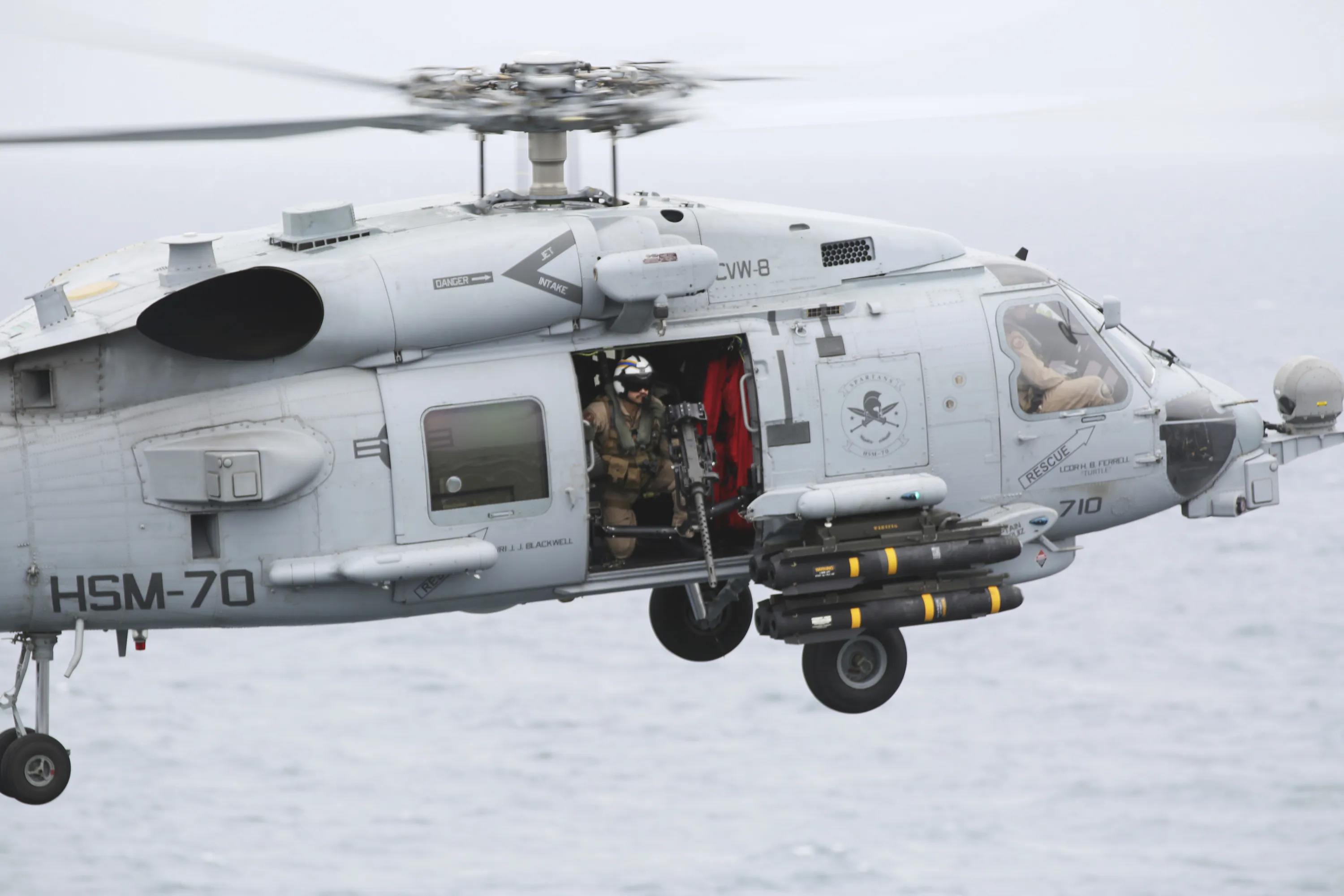 In this Tuesday, March 21, 2017 photograph, an MH-60 helicopter lands on the USS George H.W. Bush as it travels through the Strait of Hormuz. The arrival of the nuclear-powered aircraft carrier to the Persian Gulf marks the first such deployment under new U.S. President Donald Trump. (Photo by Jon Gambrell/AP Photo)