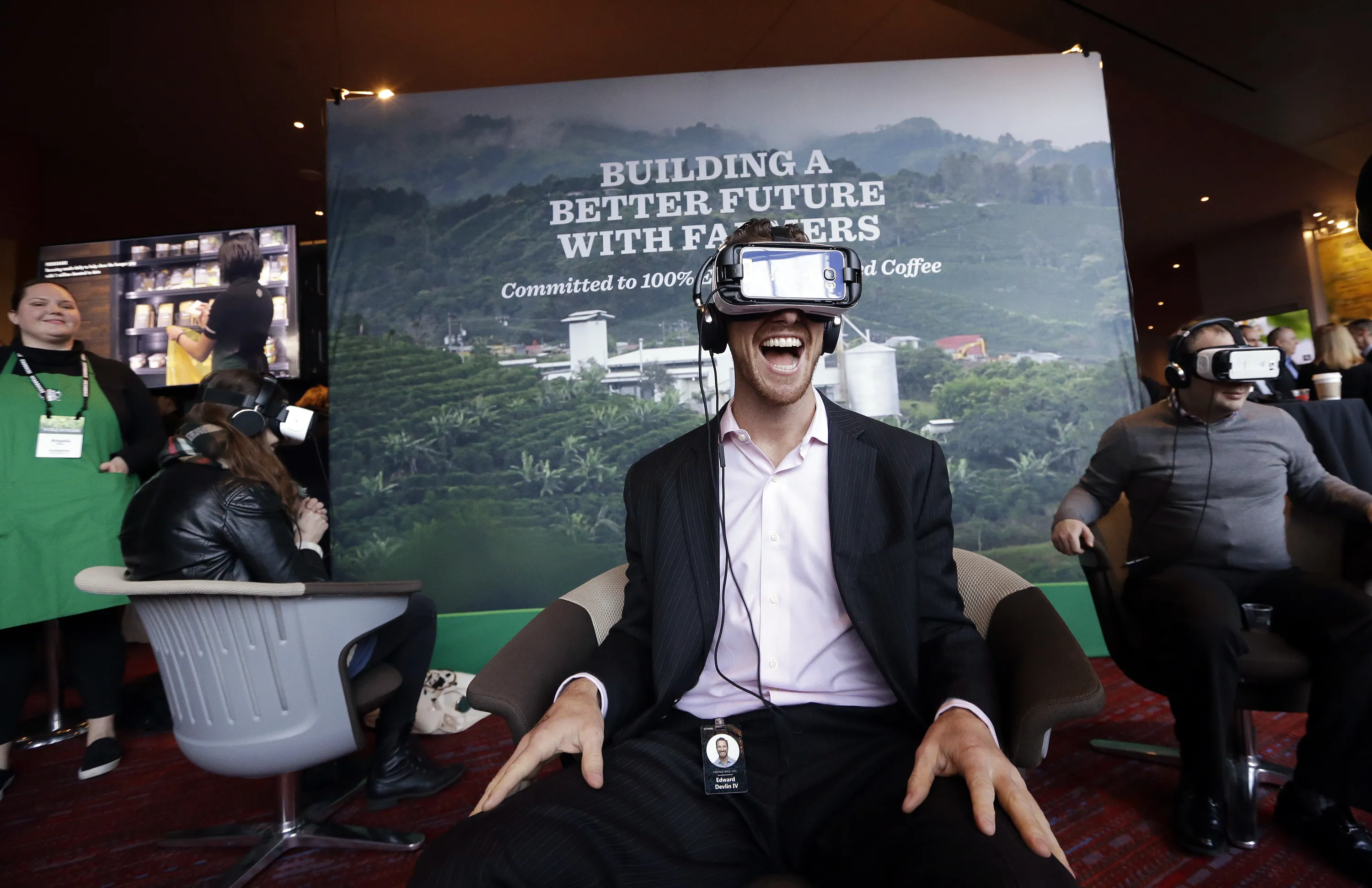 Starbucks employee Ed Devlin reacts as he views a 360 video of a Starbucks' Costa Rica coffee farm at a display before the company's annual shareholder meeting, Wednesday, March 22, 2017, in Seattle. (Photo by Elaine Thompson/AP Photo)