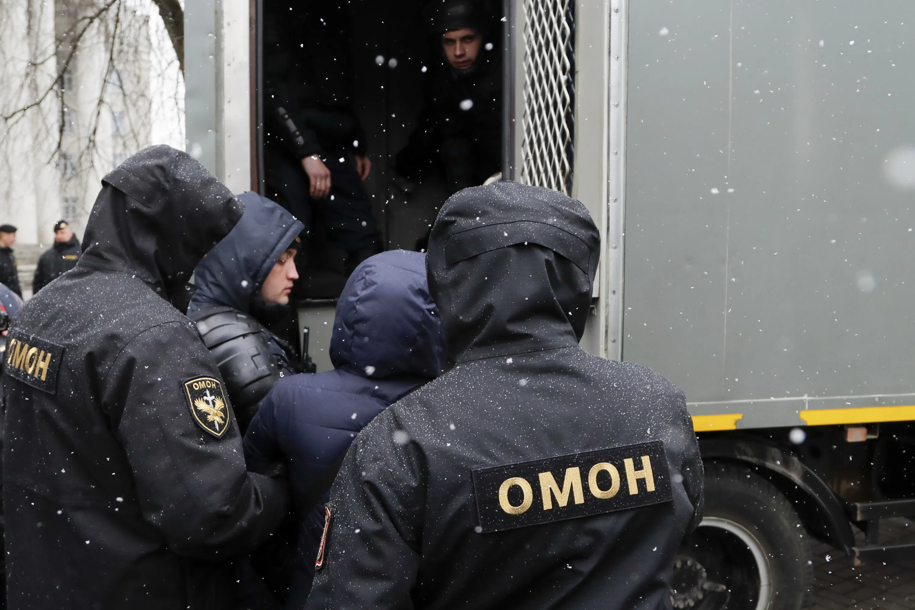 Belarus police detain an activist, center, prior to an opposition rally in Minsk, Belarus, Saturday, March 25, 2017. Over the past two months, protests have broken out across the country of 9.5 million, sometimes attracting thousands – initially they were focused on the labor law but have grown to encompass calls for the resignation of President Alexander Lukashenko, whom critics call Europe's last dictator. (Photo by Sergei Grits/AP Photo)
