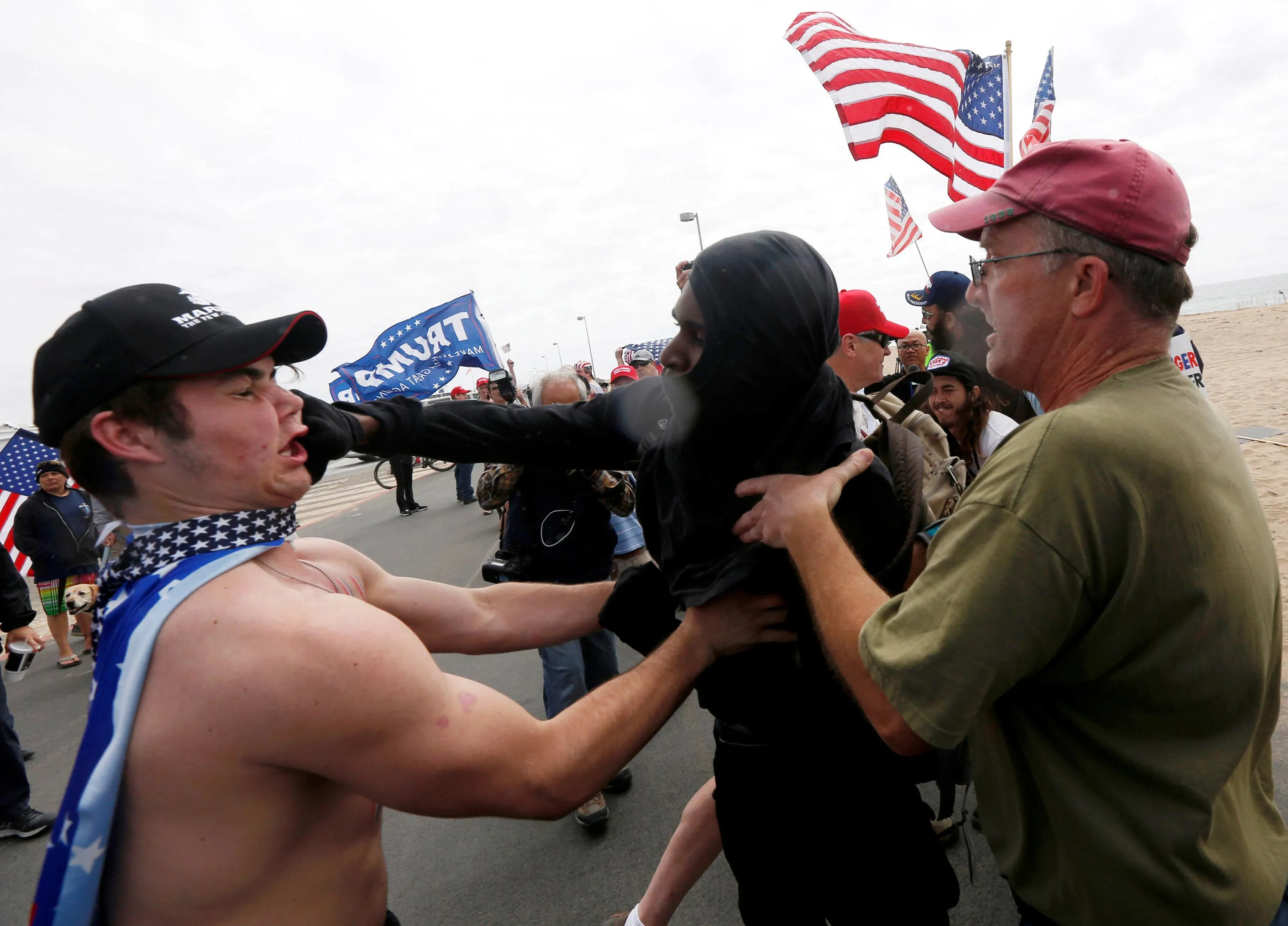 A pro-Trump rally participant is punched in the face by an anti-Trump protester as the two sides clash during a Pro-Trump rally in Huntington Beach, California, U.S., March 25, 2017. (Photo by Patrick T. Fallon/Reuters)