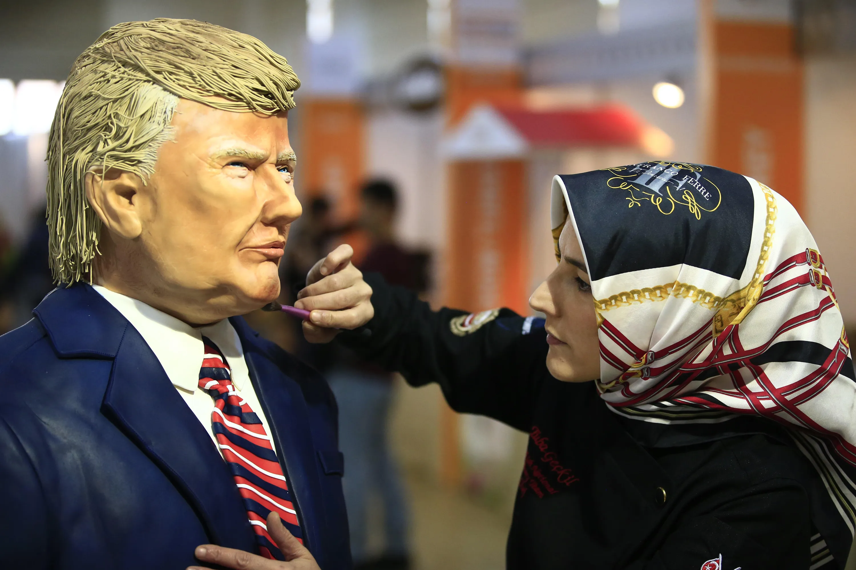 Turkish pastry chef Tuba Geckil adds the finishing touches to her figure of US President Donald Trump made out of cake icing which she created in two days, during a chocolate show in Istanbul, Saturday, March 25, 2017. (Photo by Lefteris Pitarakis/AP Photo)