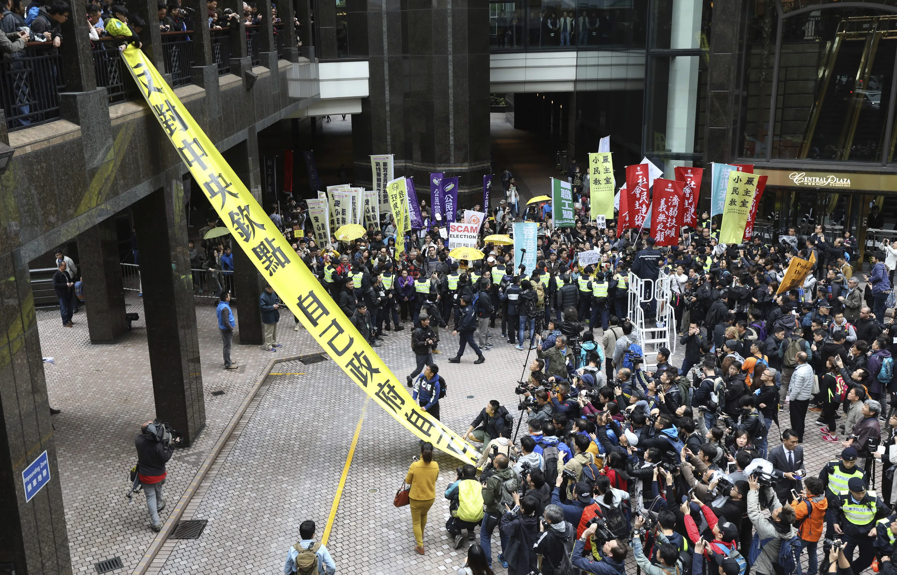 Protesters scuffle with police officers during a protest against the chief executive election in Hong Kong, Sunday, March 26, 2017. A committee dominated by pro-Beijing elites is casting ballots Sunday to choose Hong Kong's next leader in the first such vote since 2014's huge pro-democracy protests. The system has been criticized by pro-democracy activists as a “fake election”. The yellow banner reads: “Against Chinese Central Government Anointed”. (Photo by Apple Daily via AP Photo)