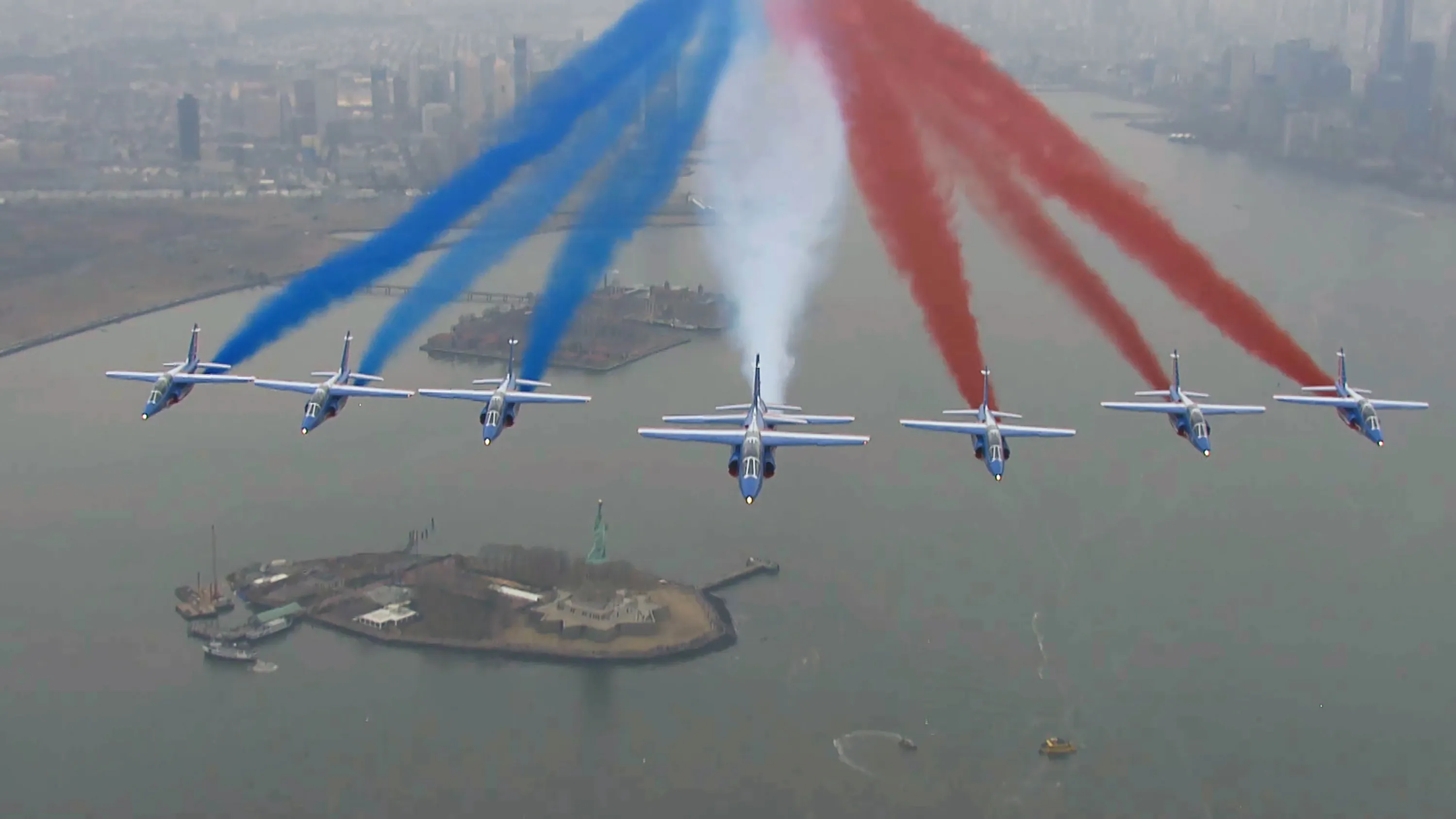 This handout framegrab taken by the French Air Force shows La Patrouille de France alphajets flying over the Statue of Liberty, as part of a 6-week tour of the US, on March 25, 2017, in New York. The tour celebrates the 100th anniversary of America's April 6, 1917, entry in World War I. (Photo by AFP Photo/French Air Force)