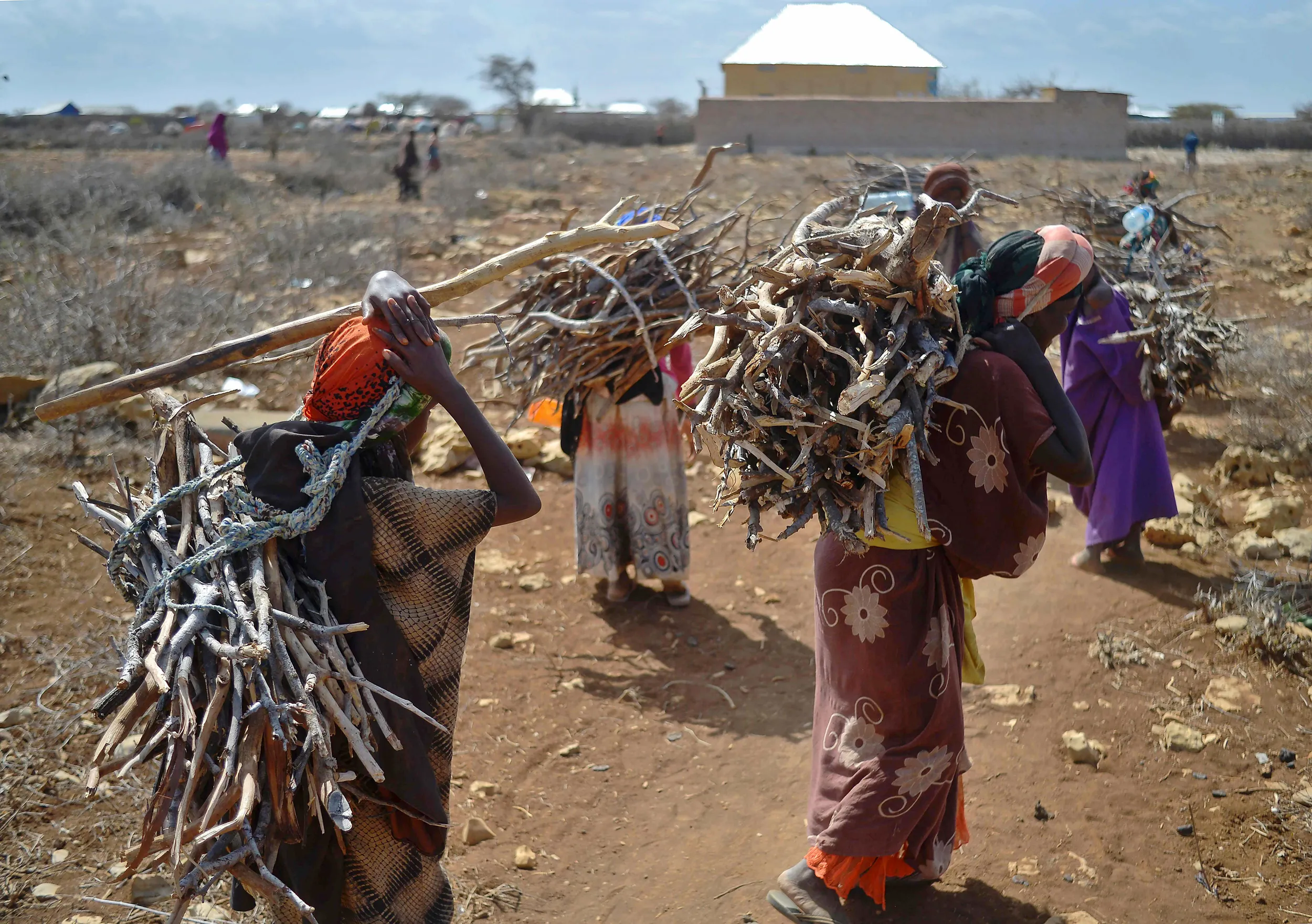 Women carry firewood on March 15, 2017 as they walk back to a makeshift camp on the outskirts of Baidoa, in the southwestern Bay region of Somalia, where thousands of internally displaced people arrive daily after they fleeing the parched countryside. (Photo by Tony Karumba/AFP Photo)