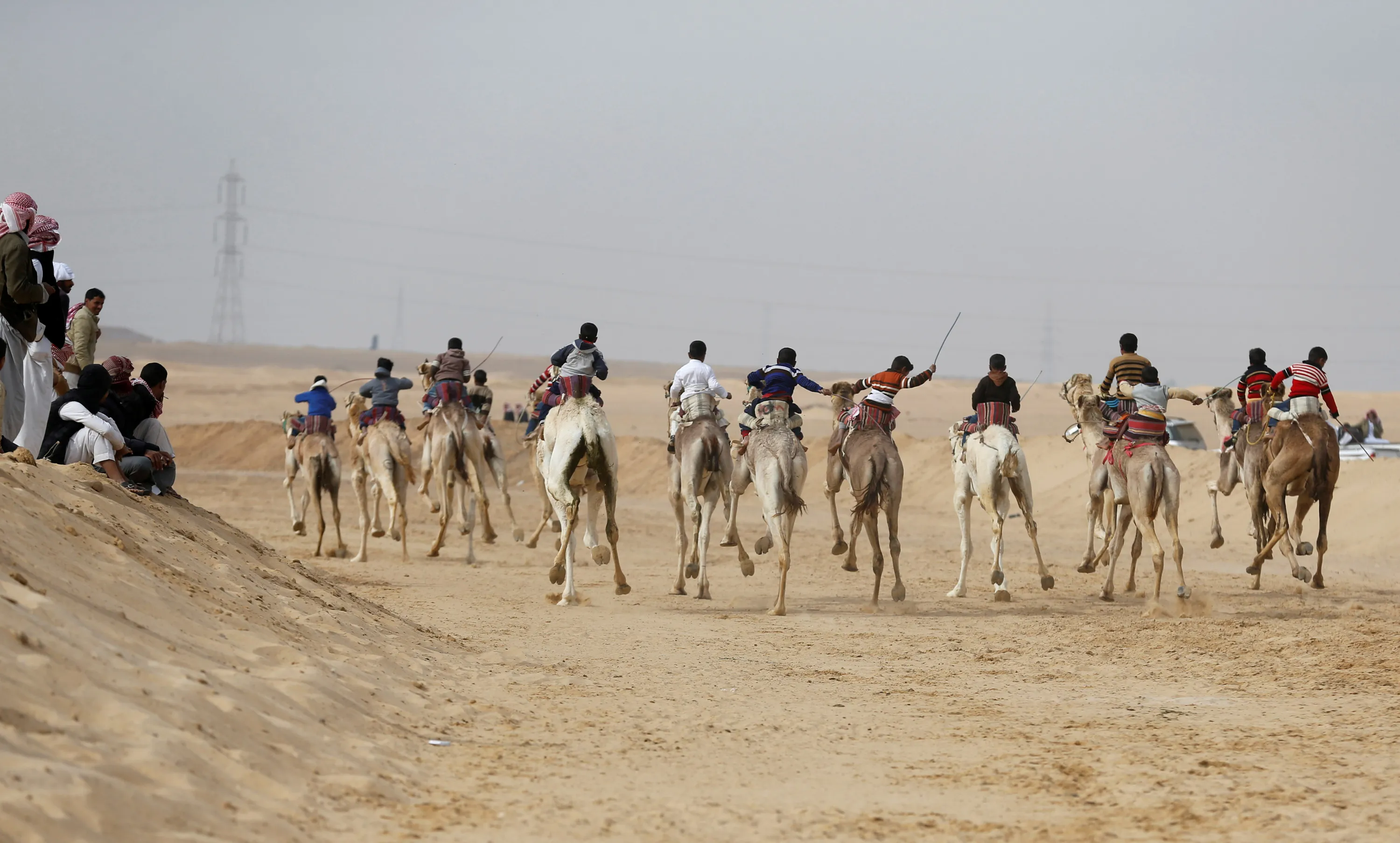 Jockeys, most of whom are children, compete on their mounts during the International Camel Racing festival at the Sarabium desert in Ismailia, Egypt, March 21, 2017. (Photo by Amr Abdallah Dalsh/Reuters)
