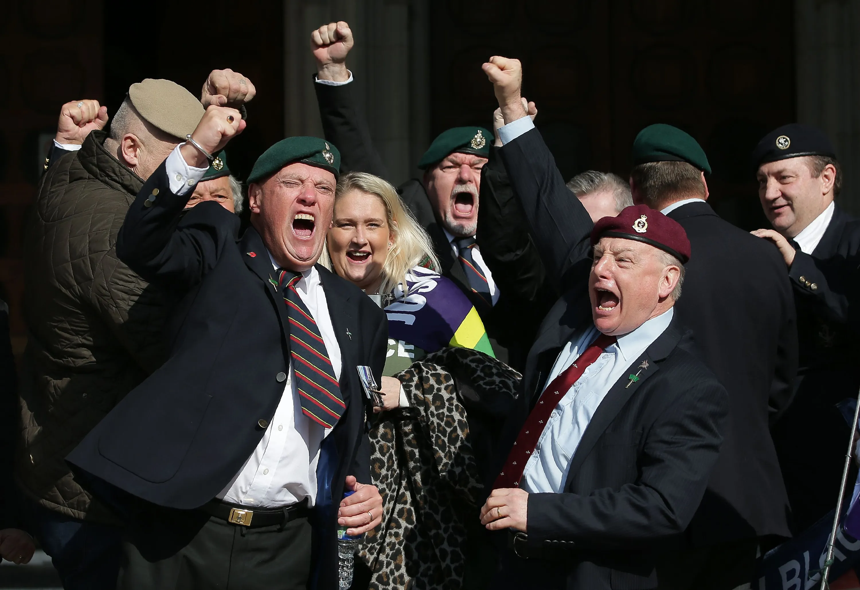 Supporters of former British soldier Alexander Blackman, Marine A, react outside the The Royal Courts of Justice in London on March 28, 2017, after learning the result of his sentence Blackman, the Royal Marine who shot an injured Taliban fighter in Afghanistan in 2011, had his sentence reduced to seven years. Tuesday, after a court martial appeal downgraded his previous conviction to manslaughter. (Photo by Daniel Leal-Olivas/AFP Photo)