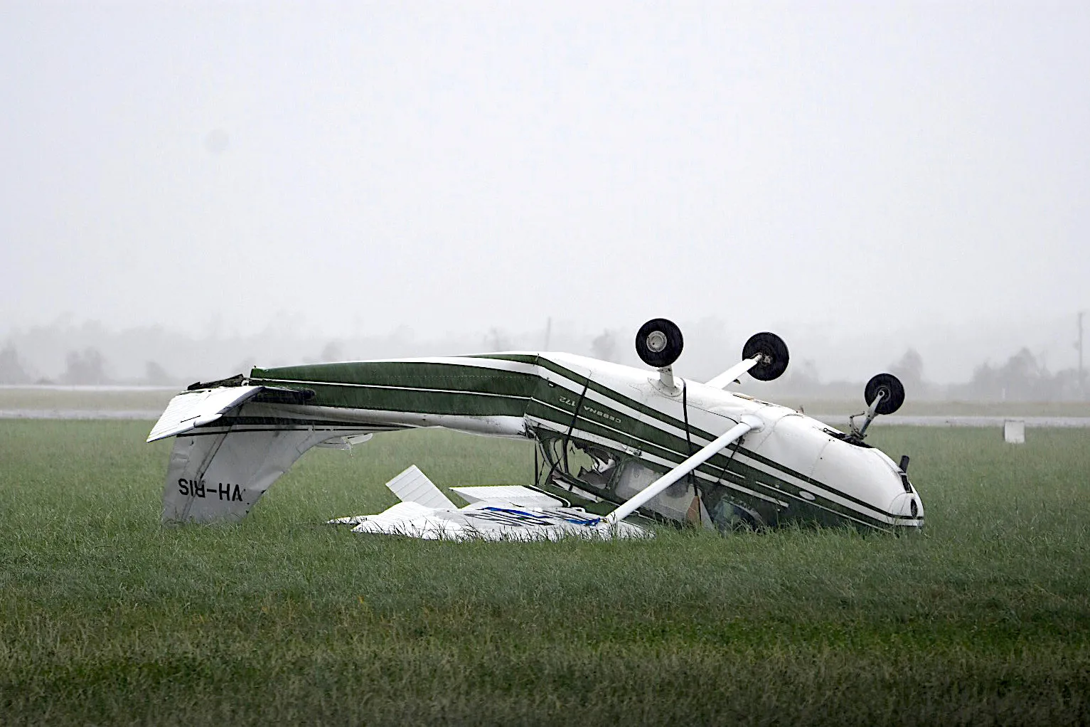 A plane that was flipped by strong winds from Cyclone Debbie is seen at the airport in the town of Bowen, Australia, Wednesday, March 29, 2017. (Photo by Sarah Motherwell/Reuters/AAP)