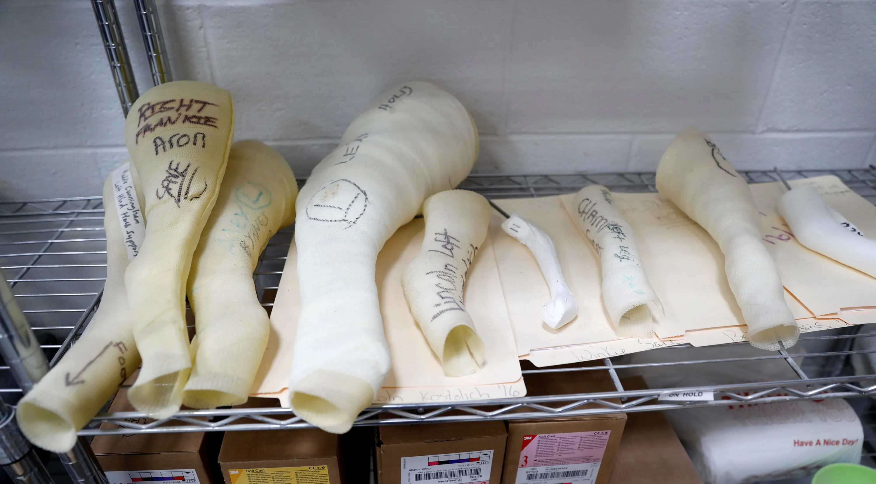 Various molds for animal prosthetics made by Derrick Campana of Animal Ortho Care sit upon a shelf at their facility in Sterling, Virginia, U.S., March 27, 2017. (Photo by Kevin Lamarque/Reuters)