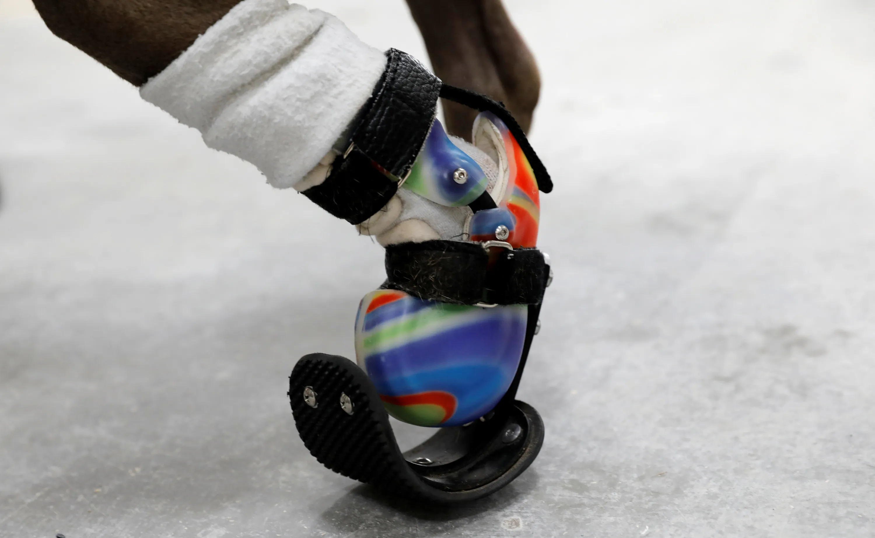 Hudson, a pitbull mix with an amputated paw, wears a prosthetic paw made by Derrick Campana of Animal Ortho Care in Sterling, Virginia, U.S., March 27, 2017. (Photo by Kevin Lamarque/Reuters)