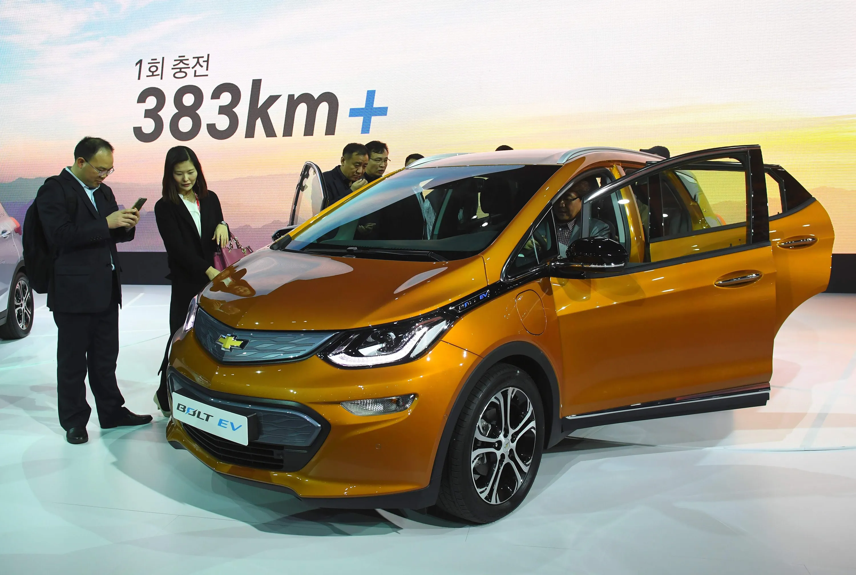 South Korean models pose with Chevrolet Bolt EV during a press preview of the Seoul Motor Show in Goyang, northwest of Seoul, on March 30, 2017. (Photo by Jung Yeon-Je/AFP Photo)