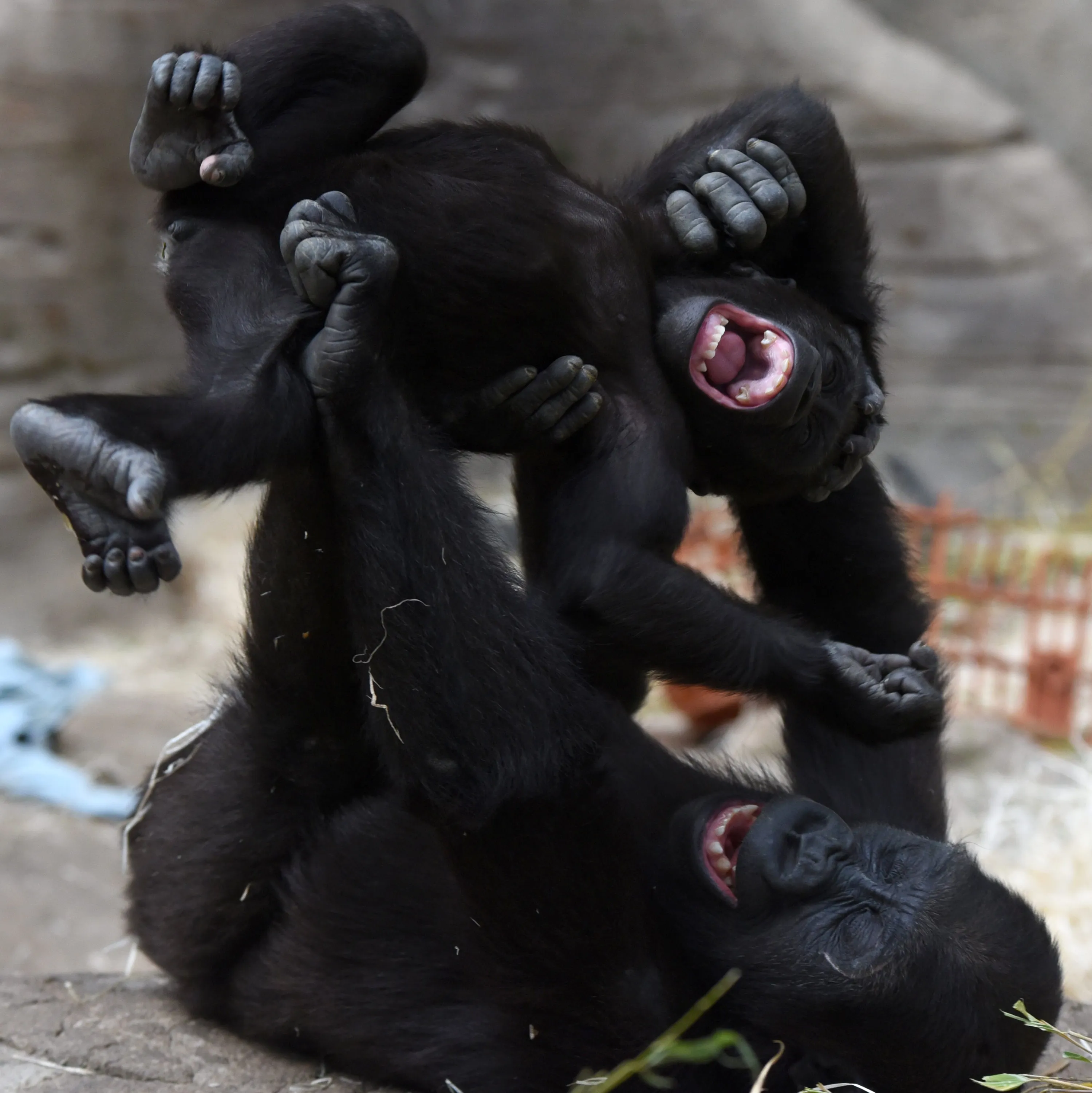 Yamila, a nine-month old western lowland gorilla, is thrown in the air playing with her brother, Gaikain, in their zoo enclosure in Madrid, Spain on March 27, 2017. (Photo by Jorge Sanz García/Pacific Press via ZUMA Wire/Rex Features/Shutterstock)