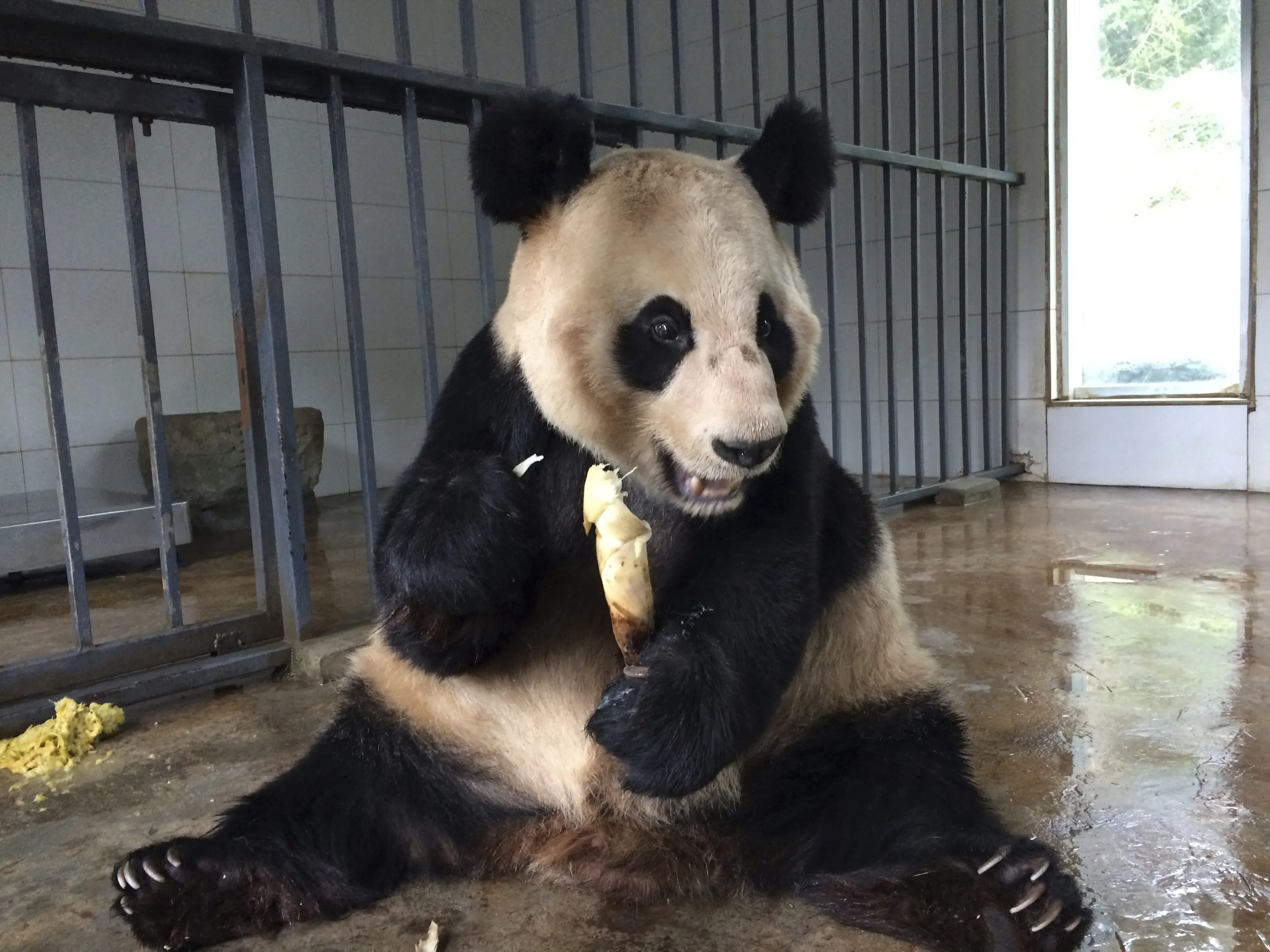 In this photo taken Saturday, March 25, 2017, 24-year-old female Giant Panda named Qiao Yuan eats a bamboo shoot at the China Conservation and Research Center for the Giant Panda Dujiangyan Base in the southwestern province of Sichuan. Failing eyesight, poor digestion, bad teeth, limbs no-longer so limber: With giant pandas in captivity living longer than ever, the list of physical and even emotional needs is growing. (Photo by Helene Franchineau/AP Photo)