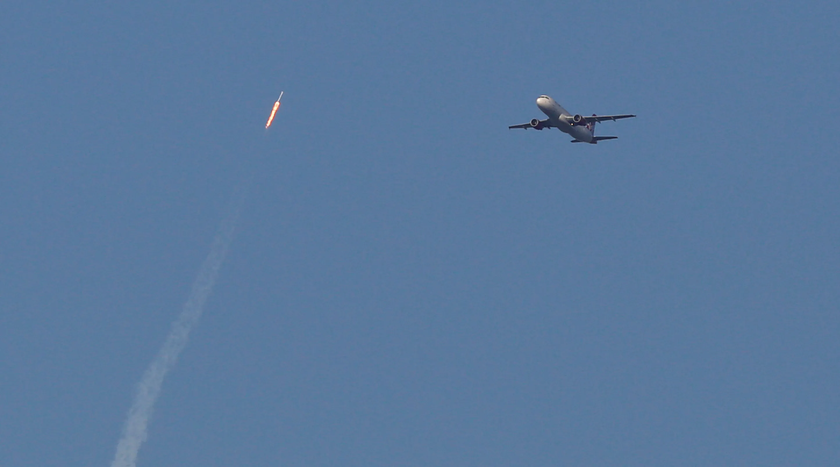 A recycled SpaceX Falcon 9 rocket soars toward space above a Virgin Airlines passenger jet, which had just departed Orlando International Airport, in Orlando, Florida, March 30, 2017. The launch marked the first time ever that a rocket was reused for spaceflight. (Photo by Gregg Newton/Reuters)