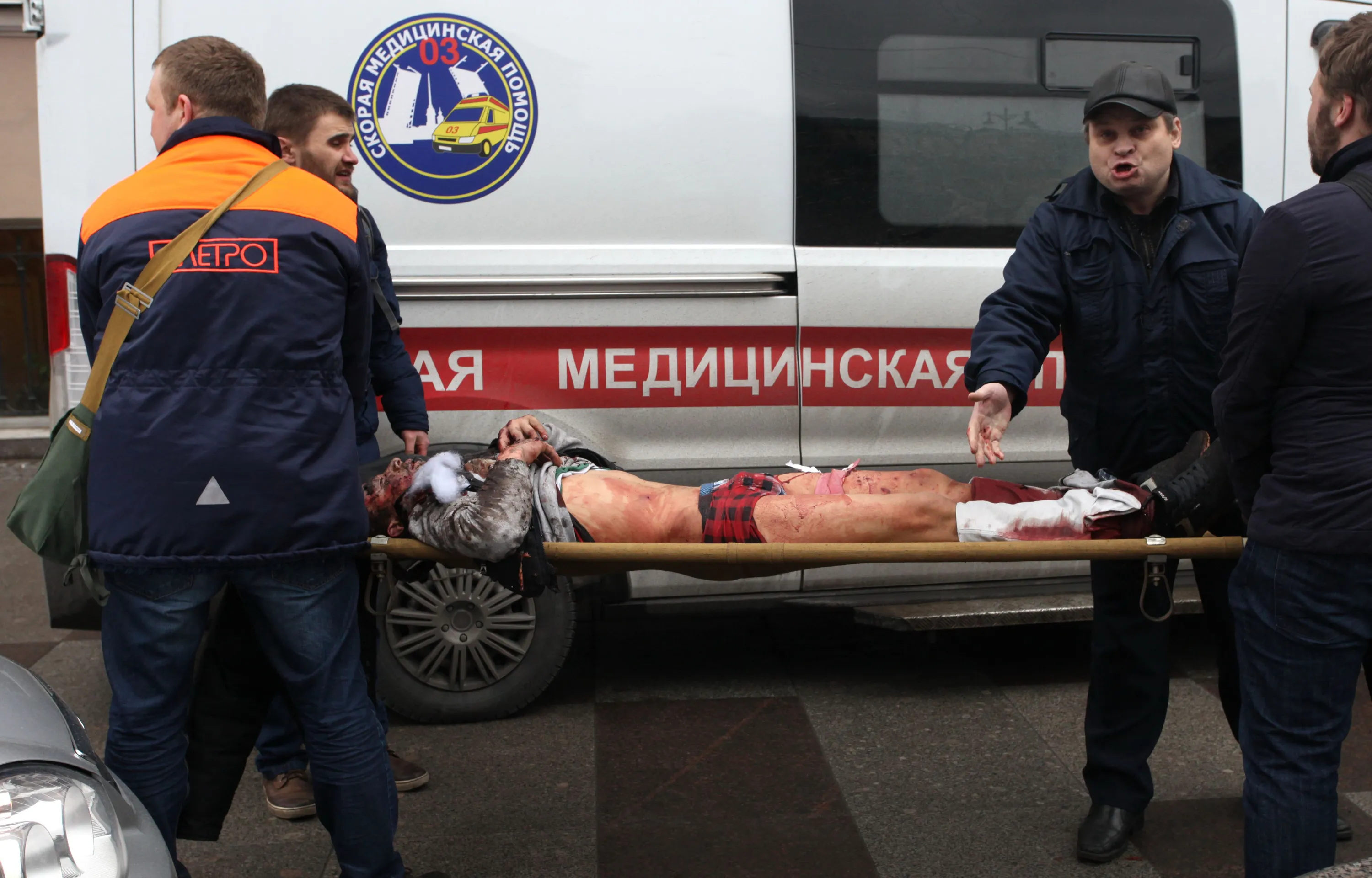 Men carry an injured person on a stretcher outside Technological Institute metro station in Saint Petersburg on April 3, 2017. (Photo by Alexander Tarasenkov/AFP Photo)