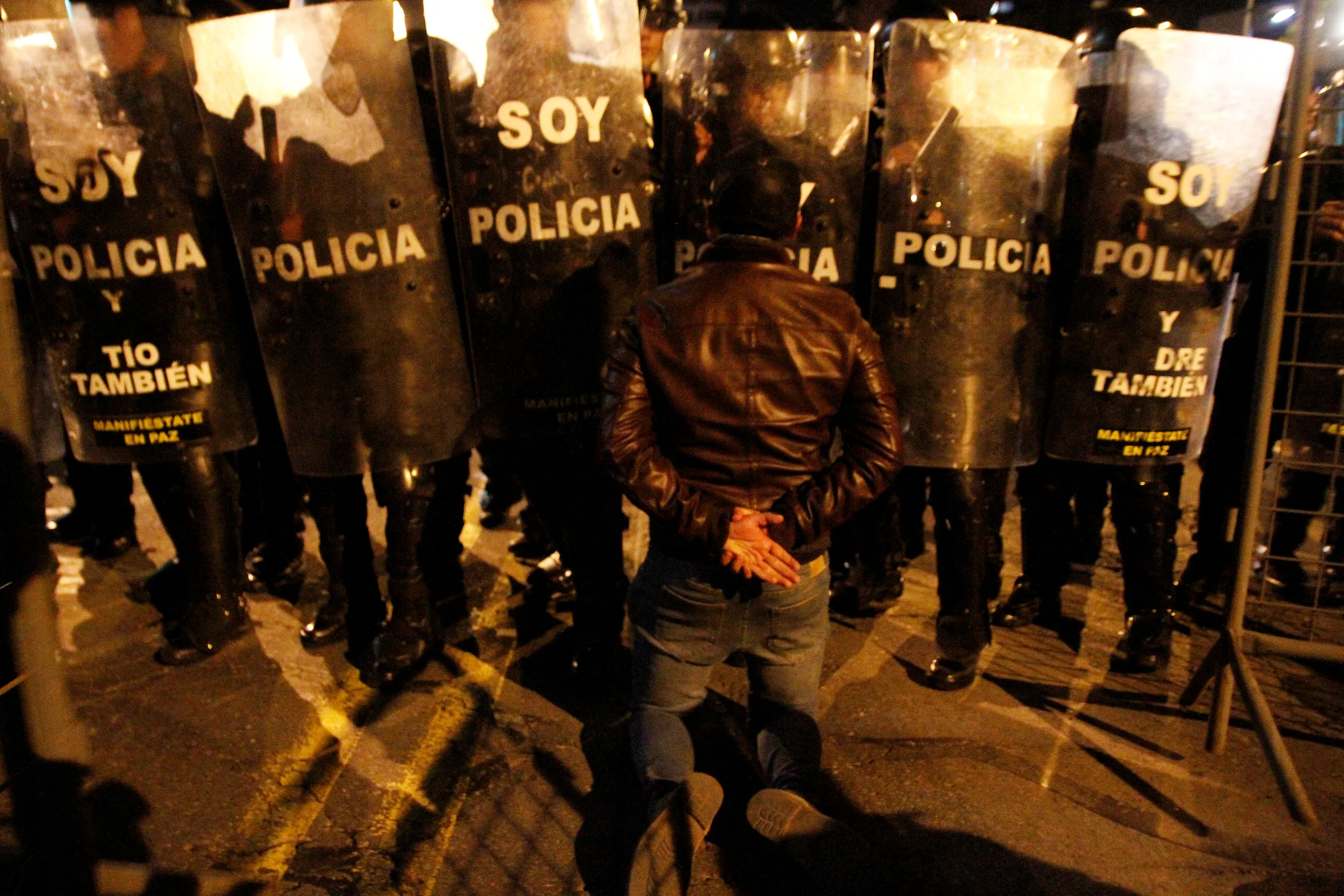 A supporter of Ecuadorean presidential candidate Guillermo Lasso demonstrates in front of riot police during a national election day in Quito, Ecuador, April 2, 2017. (Photo by Carlos Noriega/Reuters)