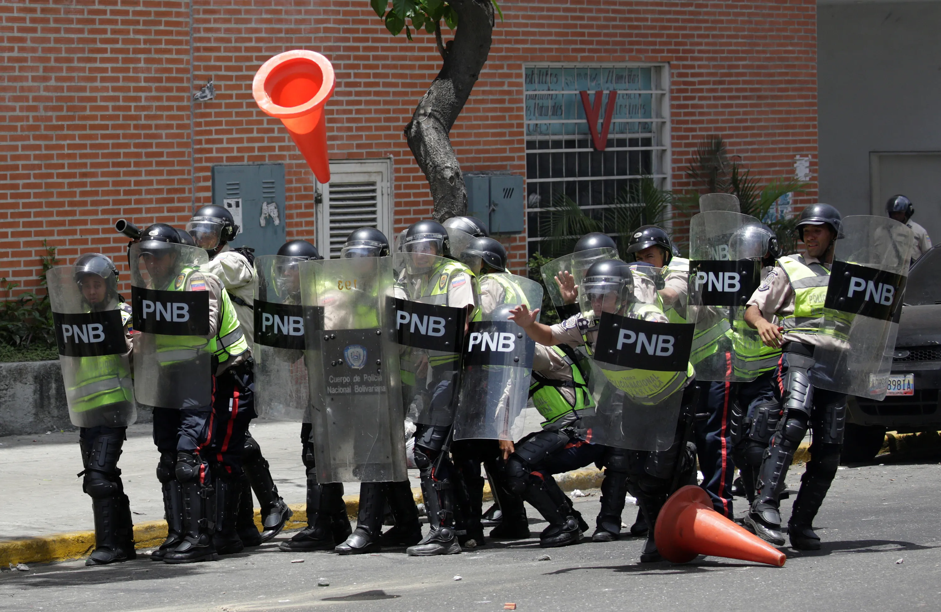 Police officers protect themselves from traffic cones thrown by demonstrators during clashes with security forces during an opposition rally in Caracas, Venezuela on April 4, 2017. (Photo by Marco Bello/Reuters)