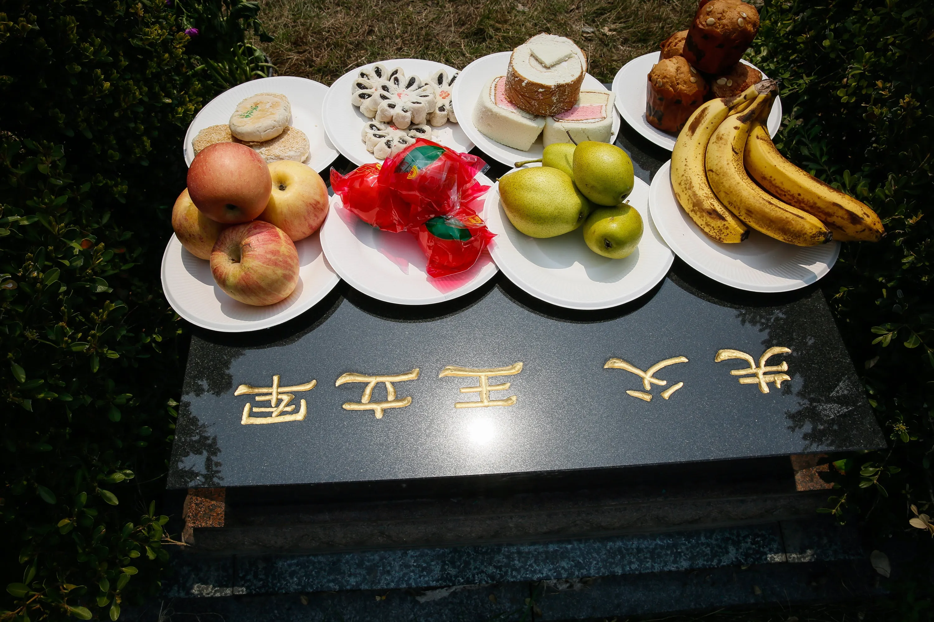 Bakery and fruits are placed on the gravesite left by Chinese people for their deceased relatives to mark the Qingming Festival at the Changqingyuan cemetery in Beijing, China, 03 April 2017. The Qingming Festival, also known as the Tomb-Sweeping Day, is marked by Chinese people by going to the cemetery to cleaning up tombs, bringing flowers, and making offerings to their ancestors. (Photo by Roman Pilipey/EPA)