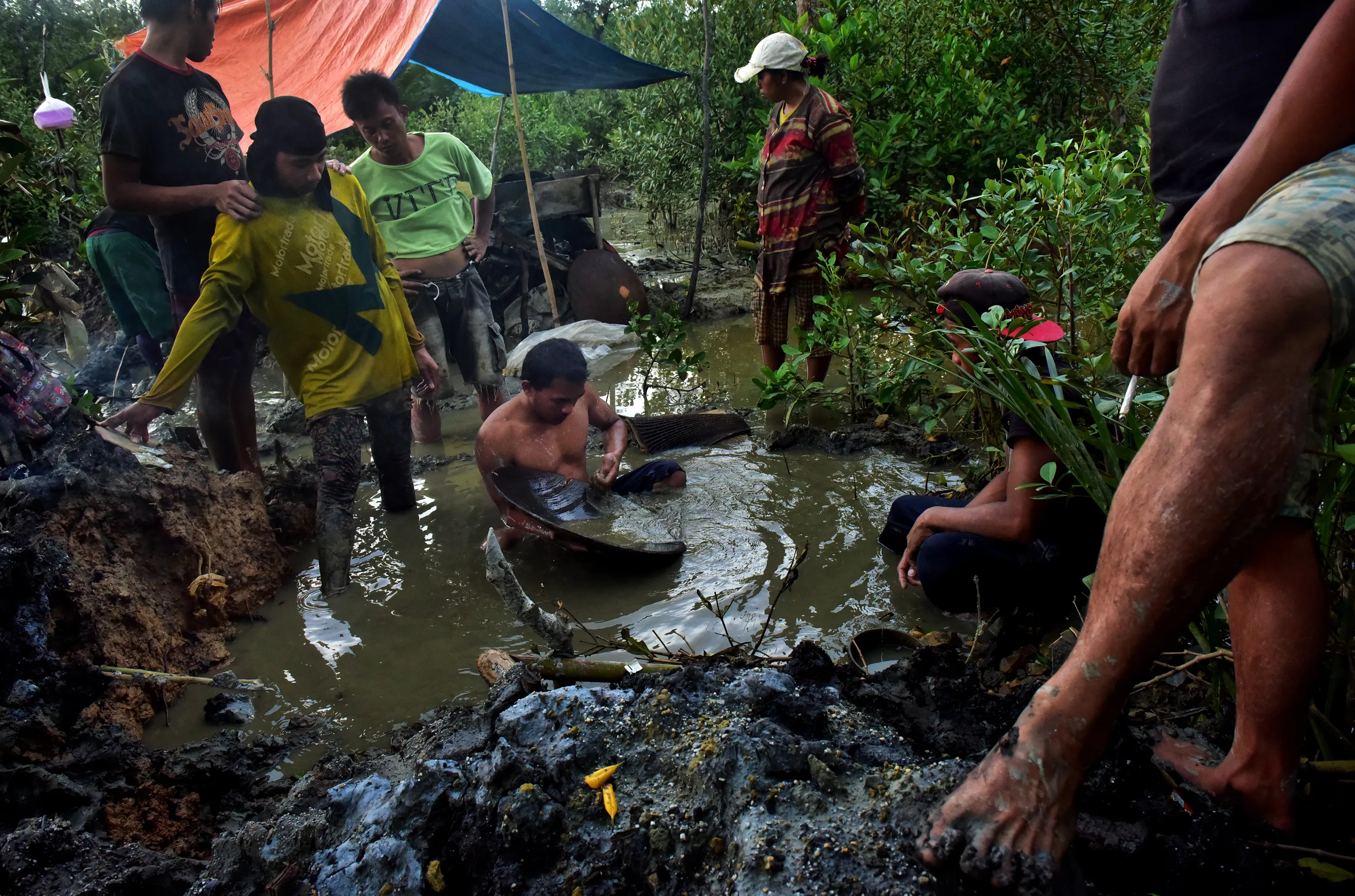 A local small scale miner panning mud to extract minute particles of gold in a pan on March 22, 2017 in Paracale, Philippines. (Photo by Jes Aznar/Getty Images)