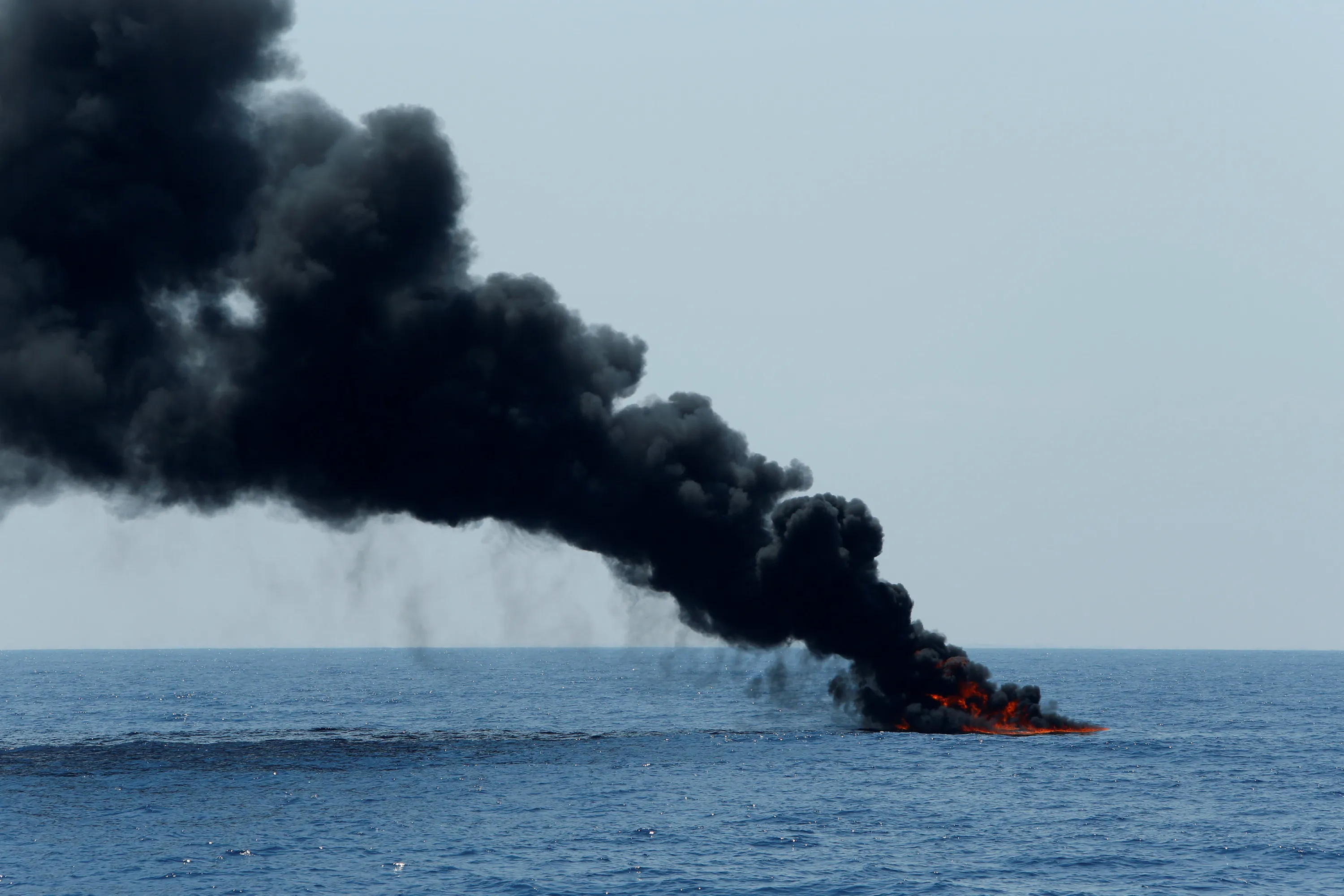 A rubber dinghy is burnt and sunk after the migrants on board were rescued by the Malta-based NGO Migrant Offshore Aid Station (MOAS) in the central Mediterranean north of Sabratha on the Libyan coast, April 5, 2017. (Photo by Darrin Zammit Lupi/Reuters)