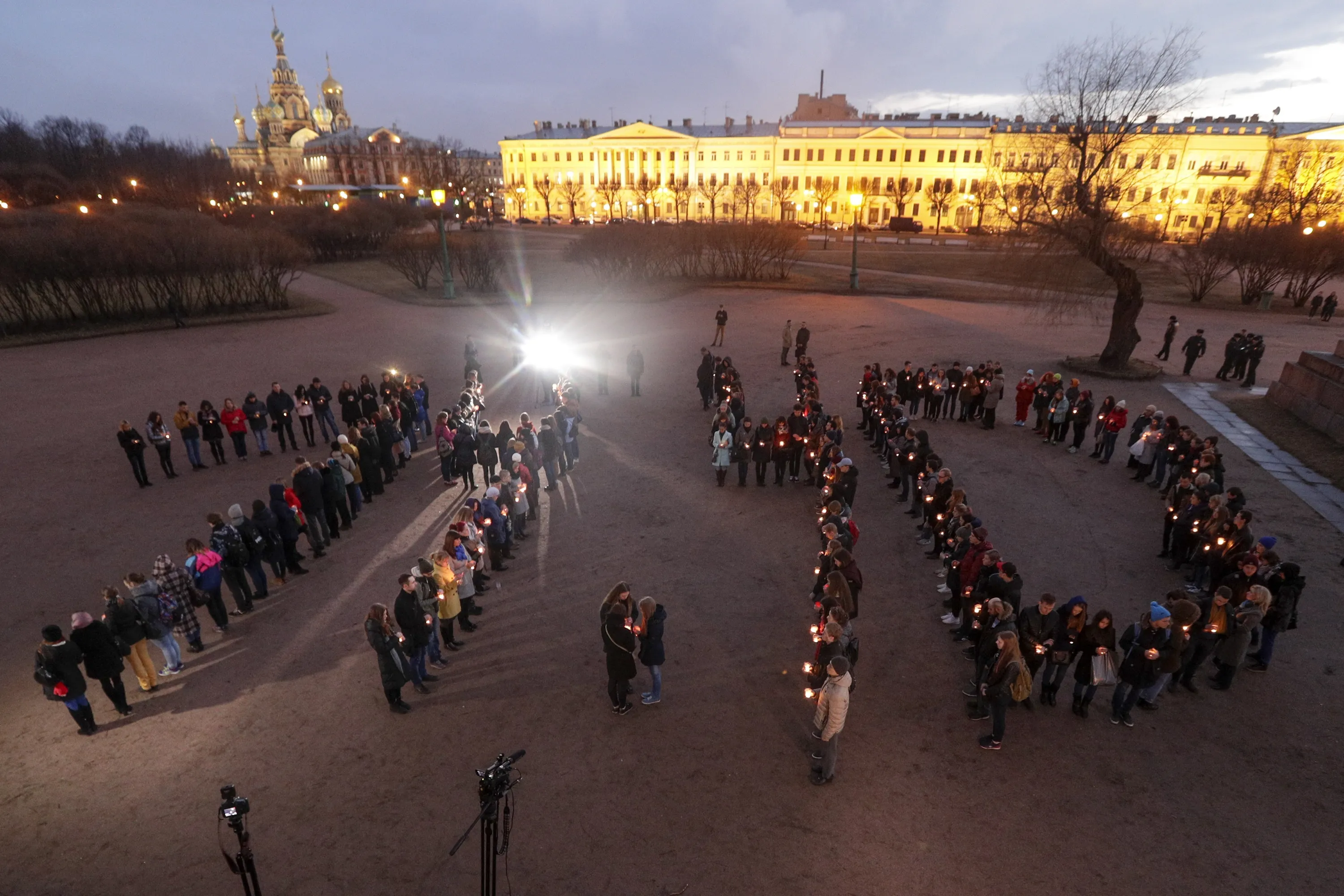 People form digits of the time of the subway bombing in memory of victims of the tragic event, on Marsovo Polye in St.Petersburg, Russia, Wednesday, April 5, 2017. A bomb blast tore through a subway train under Russia's second-largest city on Monday, killing several people and wounding more. (Photo by Dmitri Lovetsky/AP Photo)