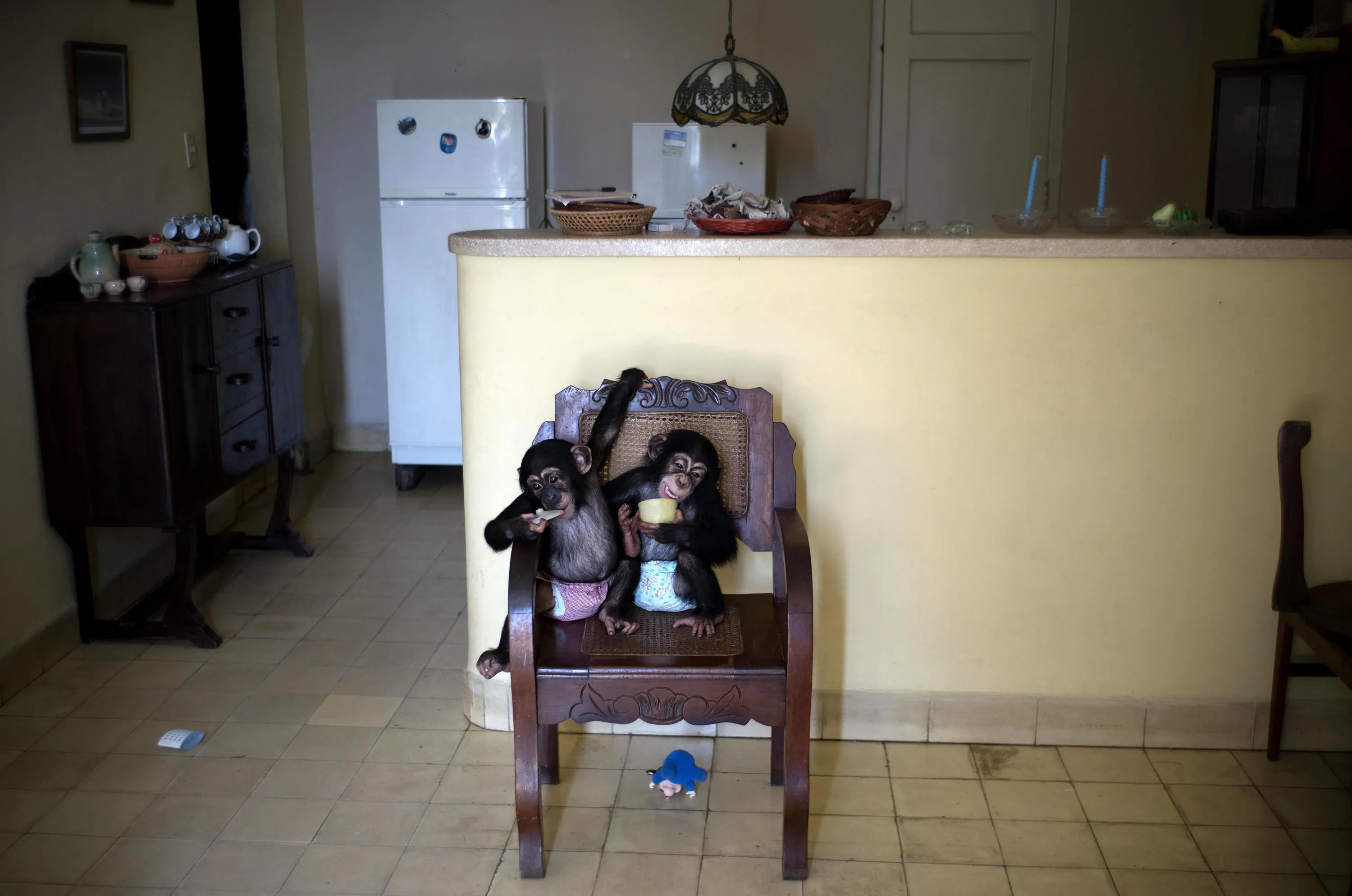 In this April 4, 2017 photo, baby chimpanzee Anuma II, left, and Ada rest in a chair at zoologist Martha Llanes' apartment in Havana, Cuba. Llanes' apartment looks like any that's home to two infants, albeit infants able to scramble up chairs, tables and virtually any other object with already-strong arms and legs and feet with opposable thumbs. (Photo by Ramon Espinosa/AP Photo)