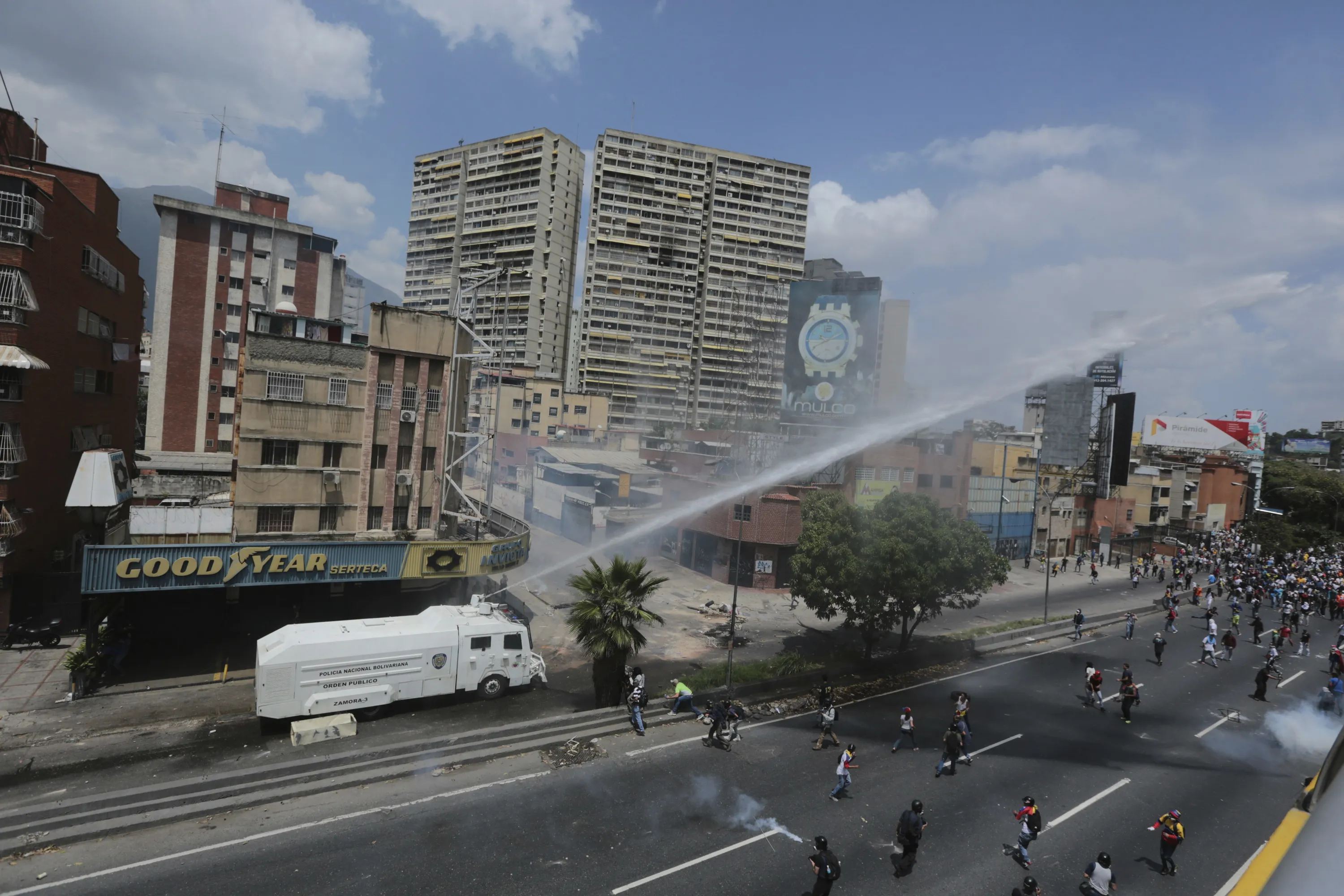 Riot police use water cannons to disperse people during a protest in Caracas, Venezuela, Thursday, April 6, 2017. (Photo by Fernando Llano/AP Photo)