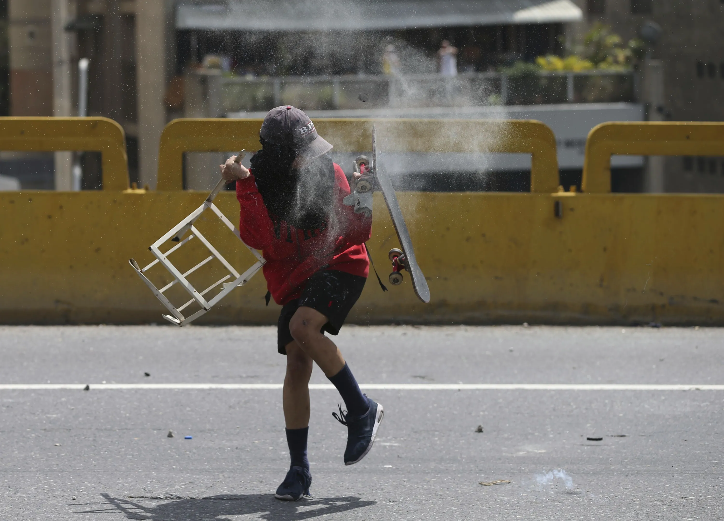 A demonstrator protects himself after a tear gas canister fired by police riot crashed against his skateboard during a protest in Caracas, Venezuela, Thursday, April 6, 2017. (Photo by Fernando Llano/AP Photo)