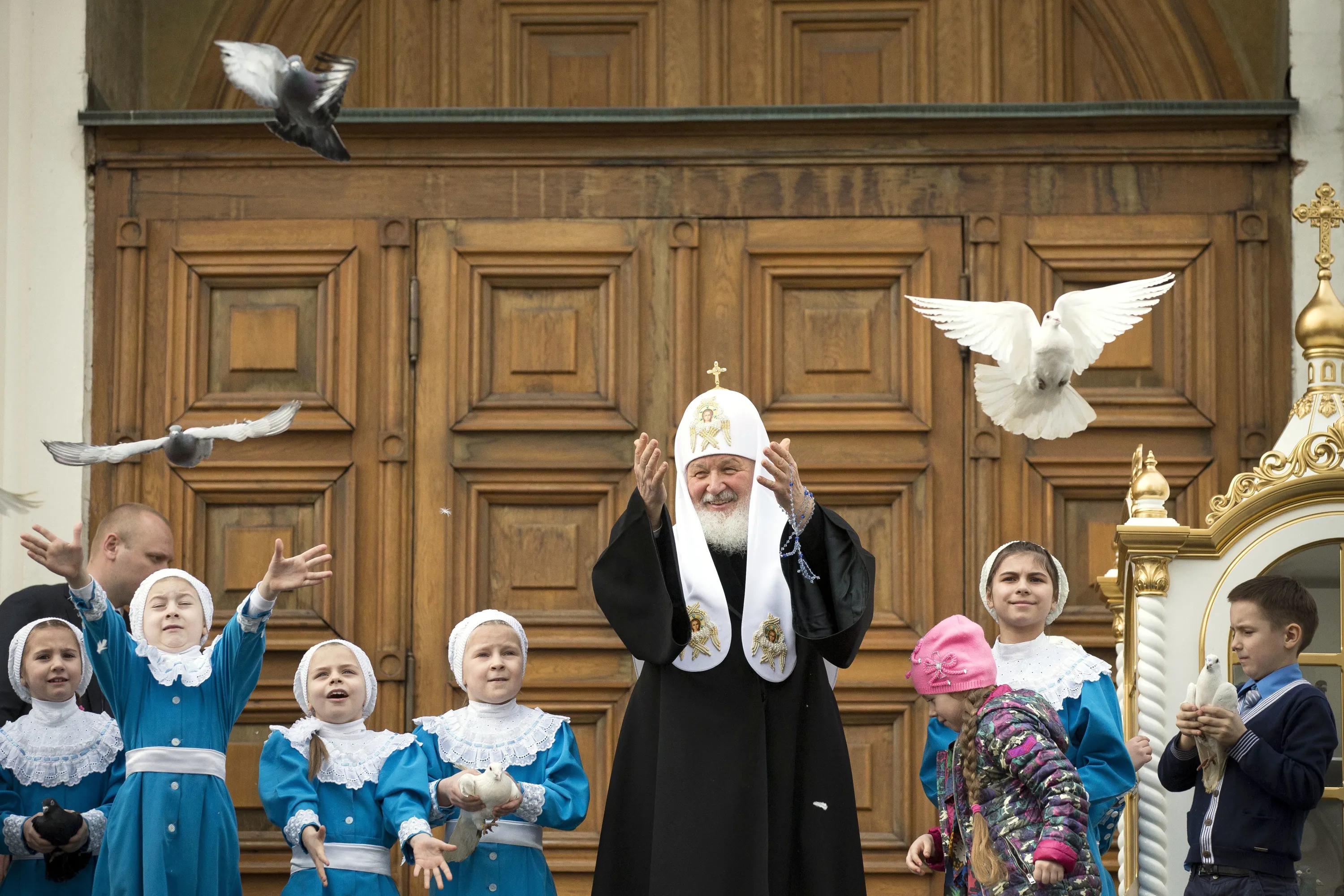 Russian Orthodox Church Patriarch Kirill, center, releases birds at Annunciation Cathedral in the Moscow's Kremlin in Moscow, Russia, Friday, April 7, 2017, to mark the Russian Orthodox holiday of the Annunciation. (Photo by Alexander Zemlianichenko/AP Photo)