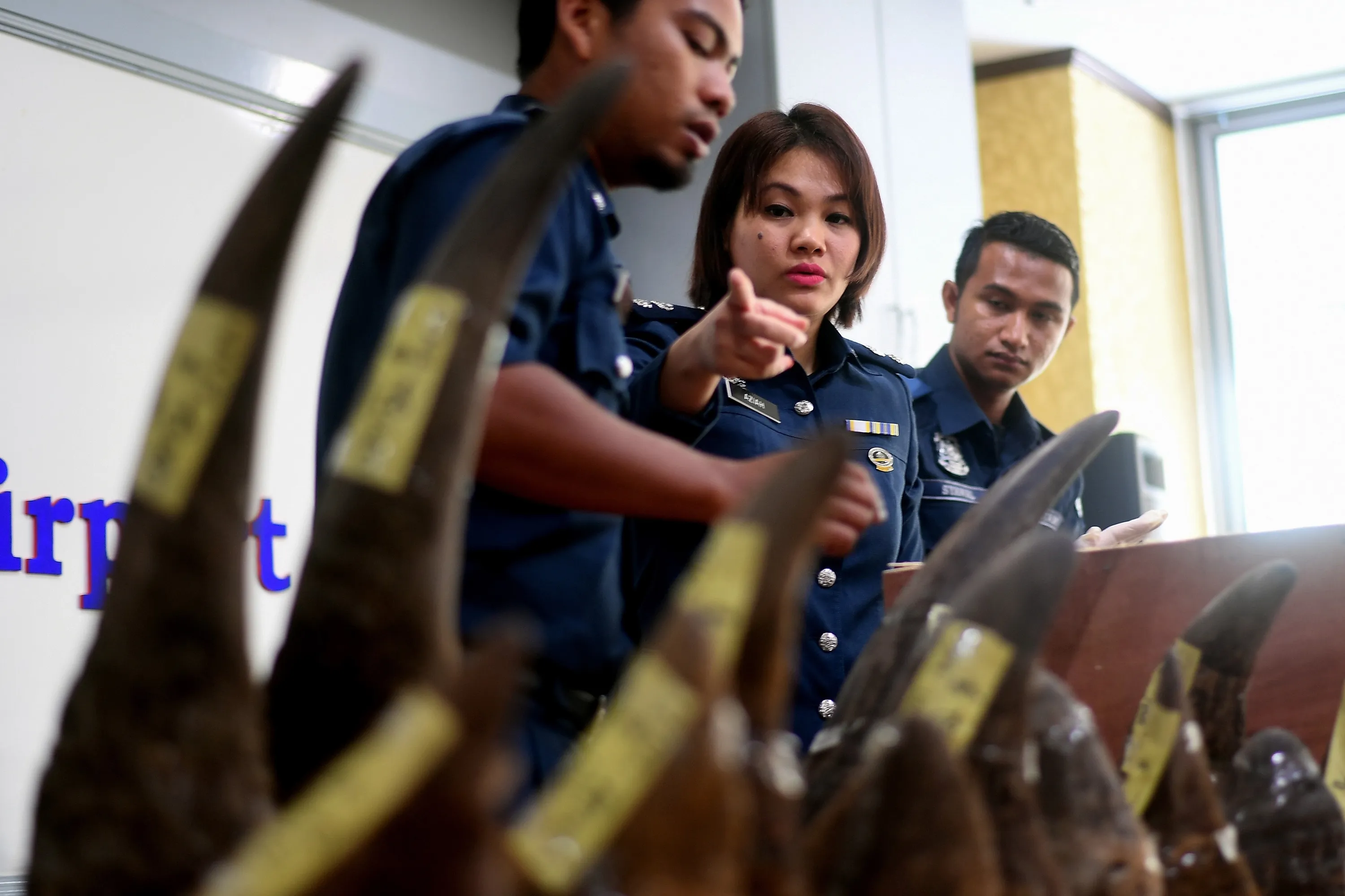 Malaysian customs officials pack seized Rhino horns following a press conference at the Customs Complex in Sepang on April 10, 2017. Enforcement officials in Malaysia have seized 18 rhino horns, weighing 51.4kg and worth 3.1 million USD which were imported from Mozambique, a senior customs official said. (Photo by Manan Vatsyayana/AFP Photo)
