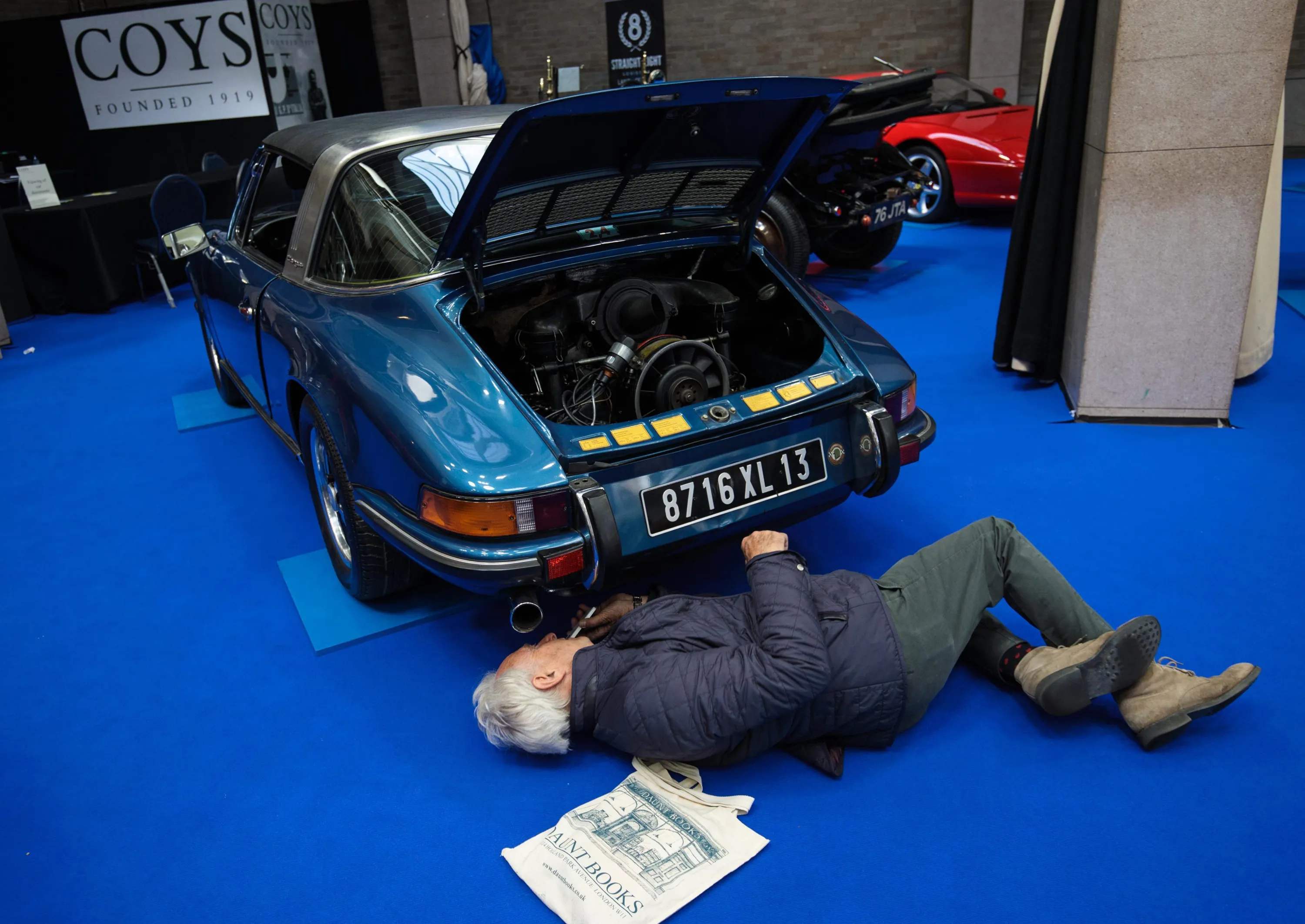 A man looks underneath a 1973 Porsche 911 Targa (estimate £55,000 - £65,000) at the Royal Horticultural Halls on April 11, 2017 in London, England. (Photo by Jack Taylor/Getty Images)