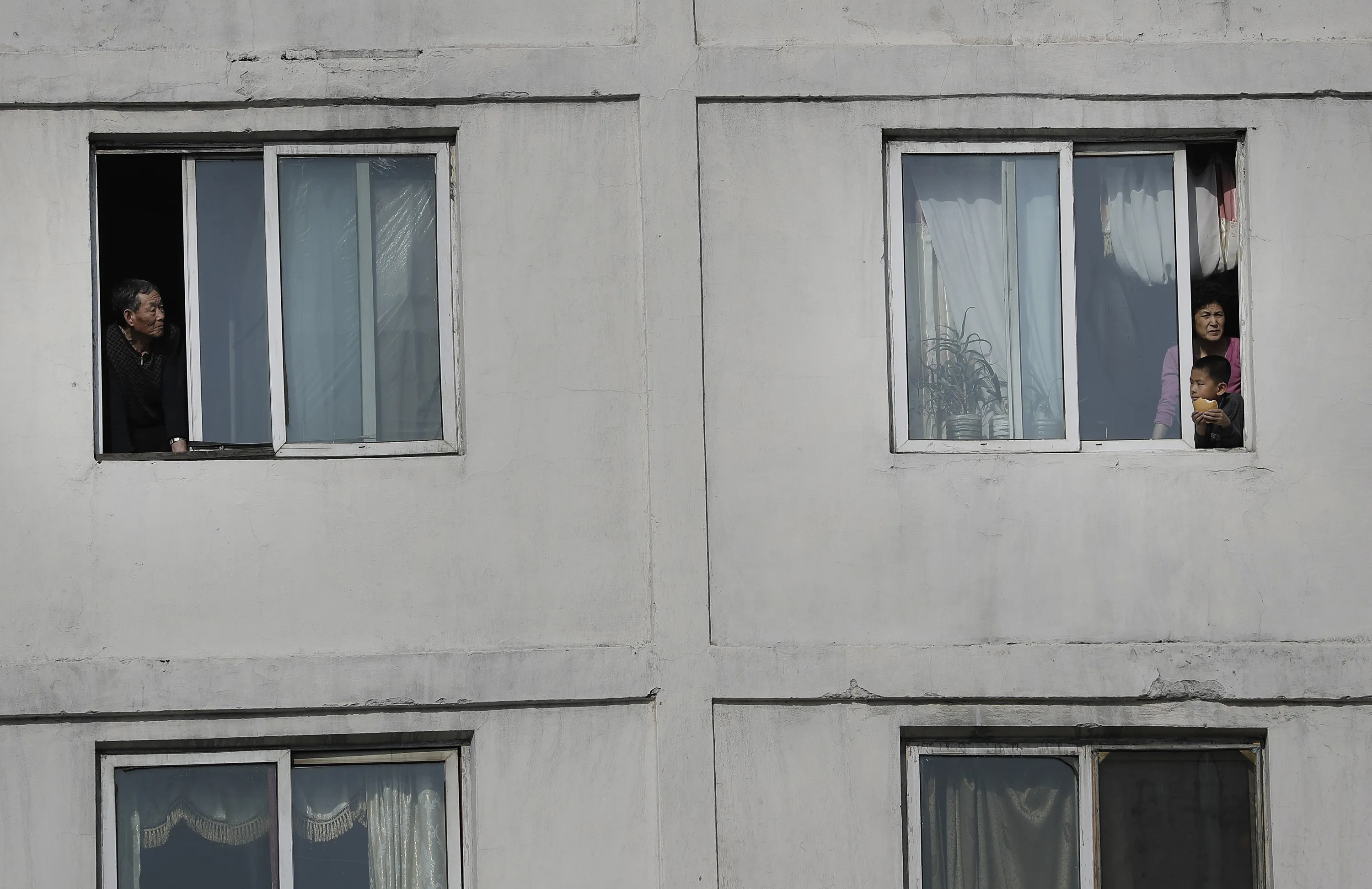 North Koreans watch runners of the Pyongyang marathon from their apartment windows on Sunday, April 9, 2017, in Pyongyang, North Korea. (Photo by Wong Maye-E/AP Photo)