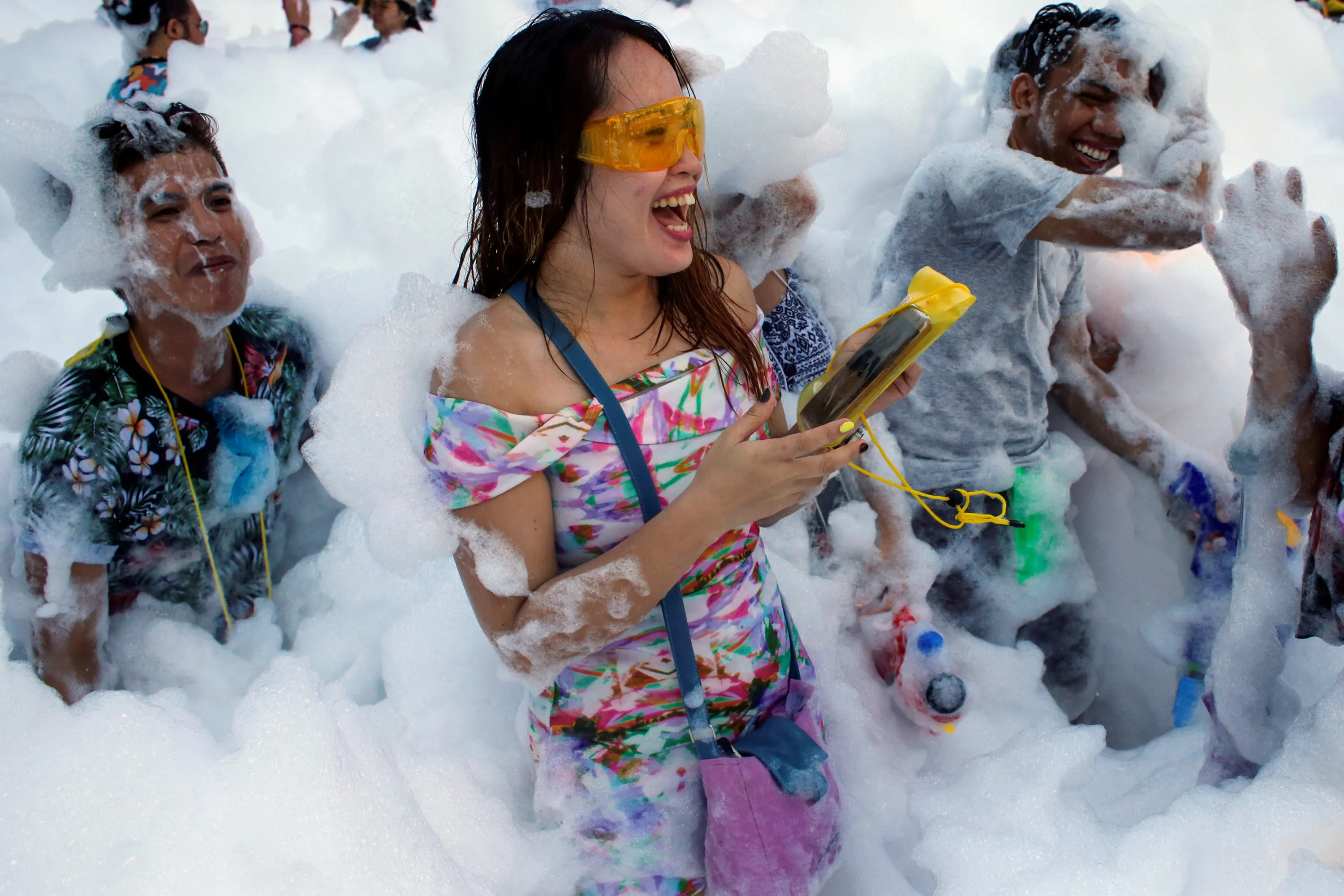 Revellers react at a foam party during Songkran Festival celebrations in Bangkok, Thailand April 13, 2017. (Photo by Jorge Silva/Reuters)