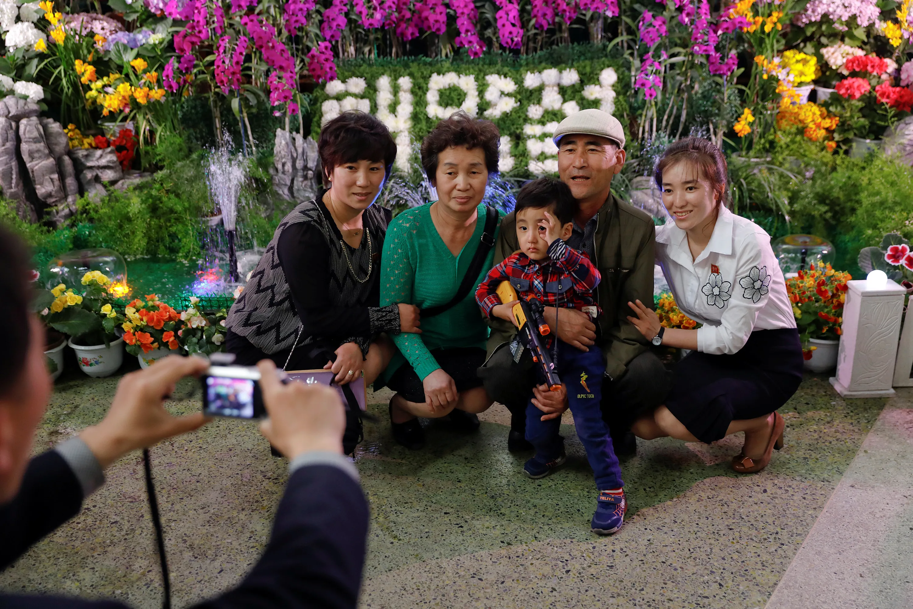 A boy holds a toy gun as souvenir photo is taken during the flower exhibition marking the 105th birth anniversary of country's founding father, Kim Il Sung in Pyongyang, North Korea April 16, 2017. (Photo by Damir Sagolj/Reuters)
