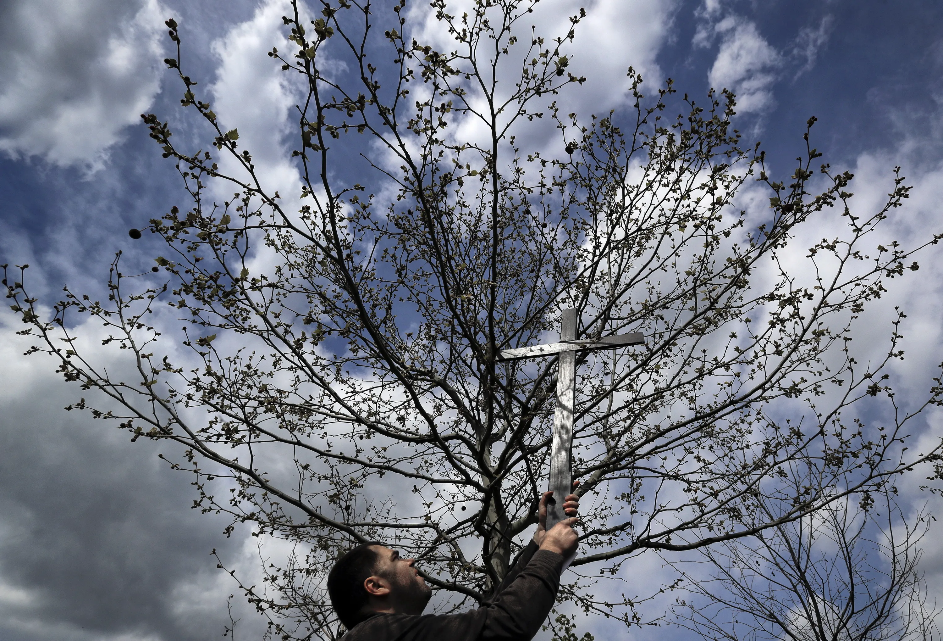 In this Saturday, April 8, 2017, picture a Romanian Catholic picks up a wooden cross from a tree before the start of a procession ahead of Palm Sunday in Bucharest, Romania. (Photo by Vadim Ghirda/AP Photo)