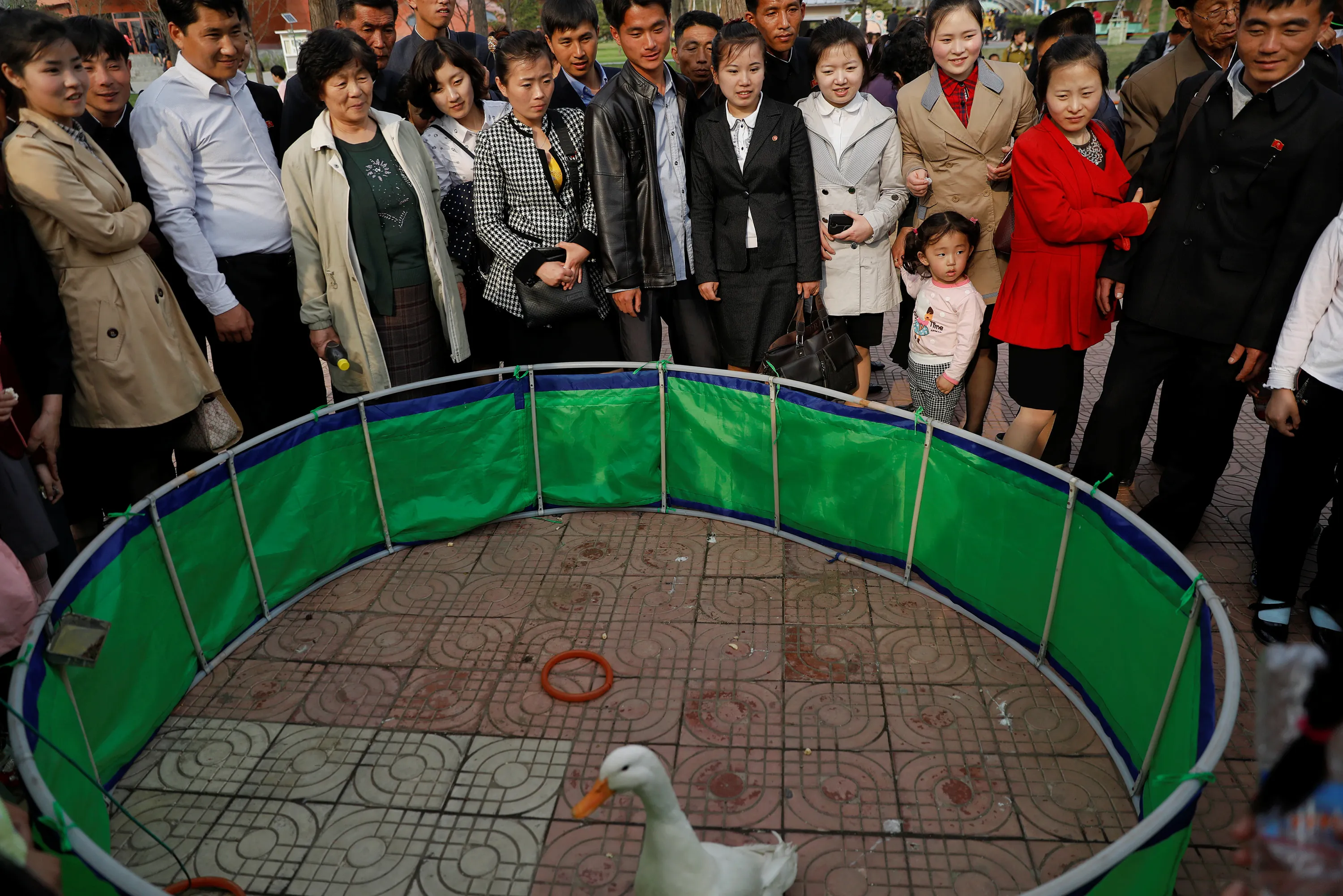 People gather around a ring with a duck in a zoo in Pyongyang, North Korea April 16, 2017. (Photo by Damir Sagolj/Reuters)