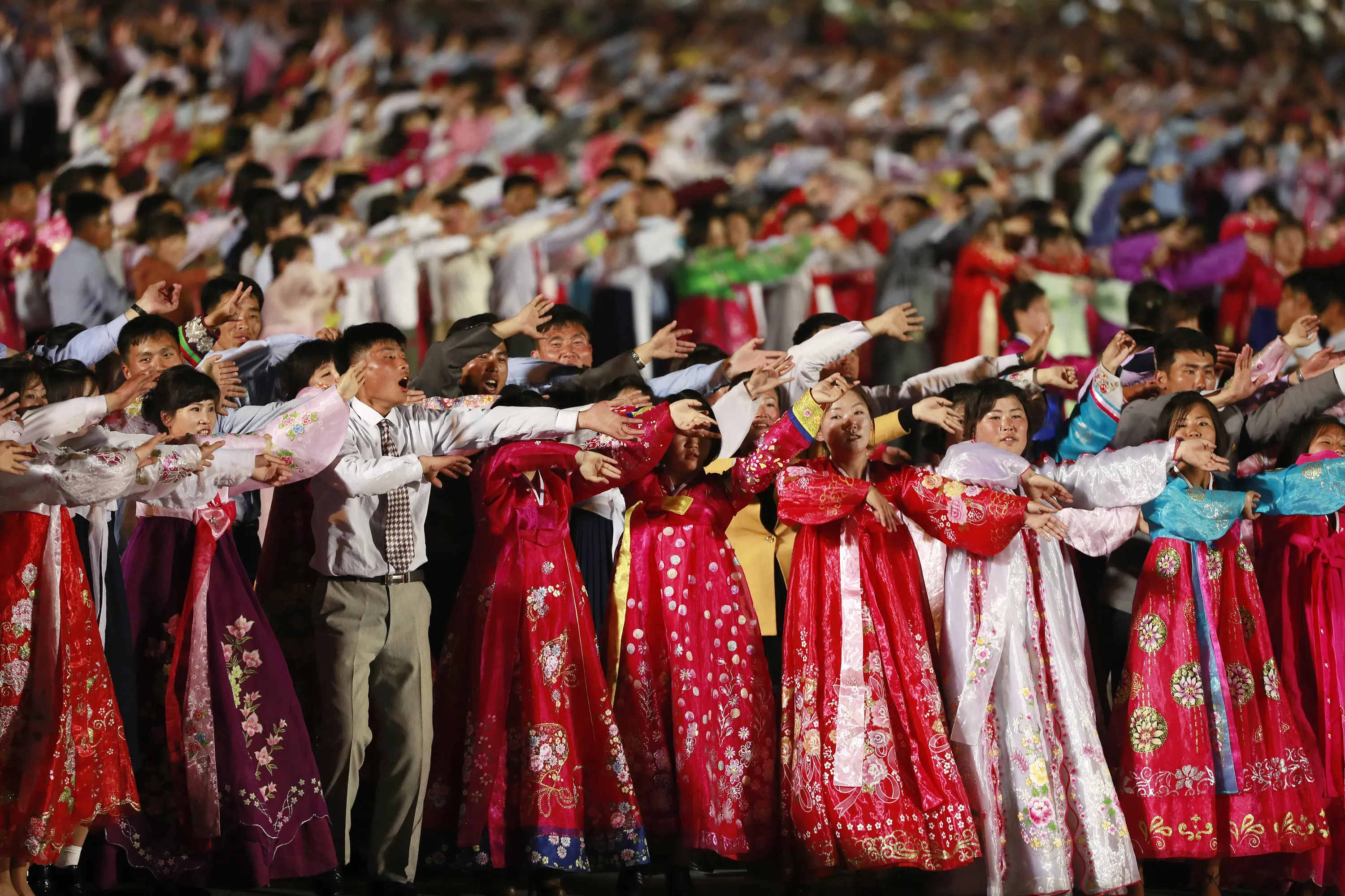 North Korean men and women perform a mass dance during a parade for the “Day of the Sun” festival on Kim Il Sung Square in Pyongyang, North Korea, 15 April 2017. (Photo by How Hwee Young/EPA)