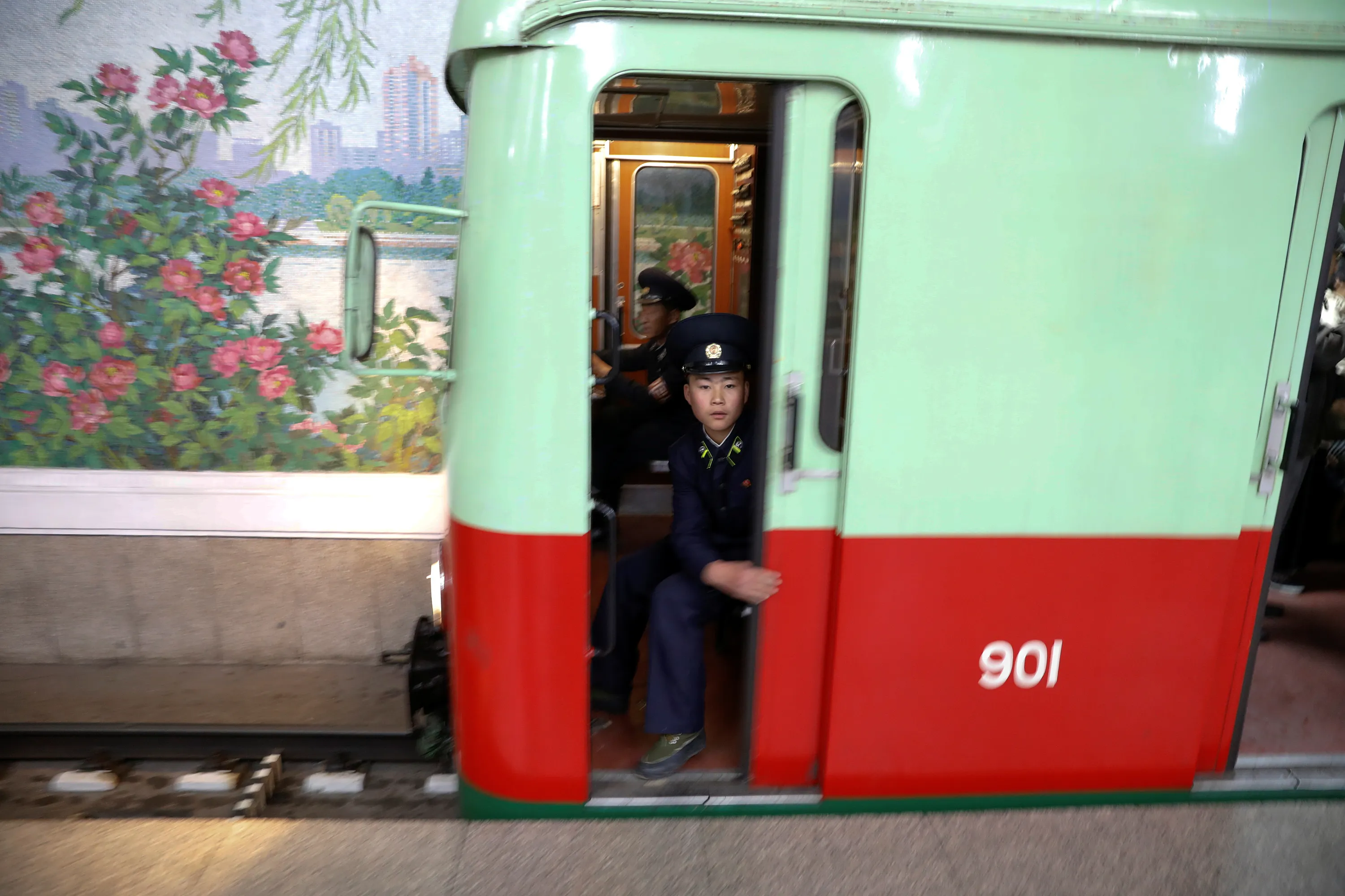 Railway worker closes the door as a train leaves a subway station visited by foreign reporters in central Pyongyang, North Korea on April 14, 2017. (Photo by Damir Sagolj/Reuters)