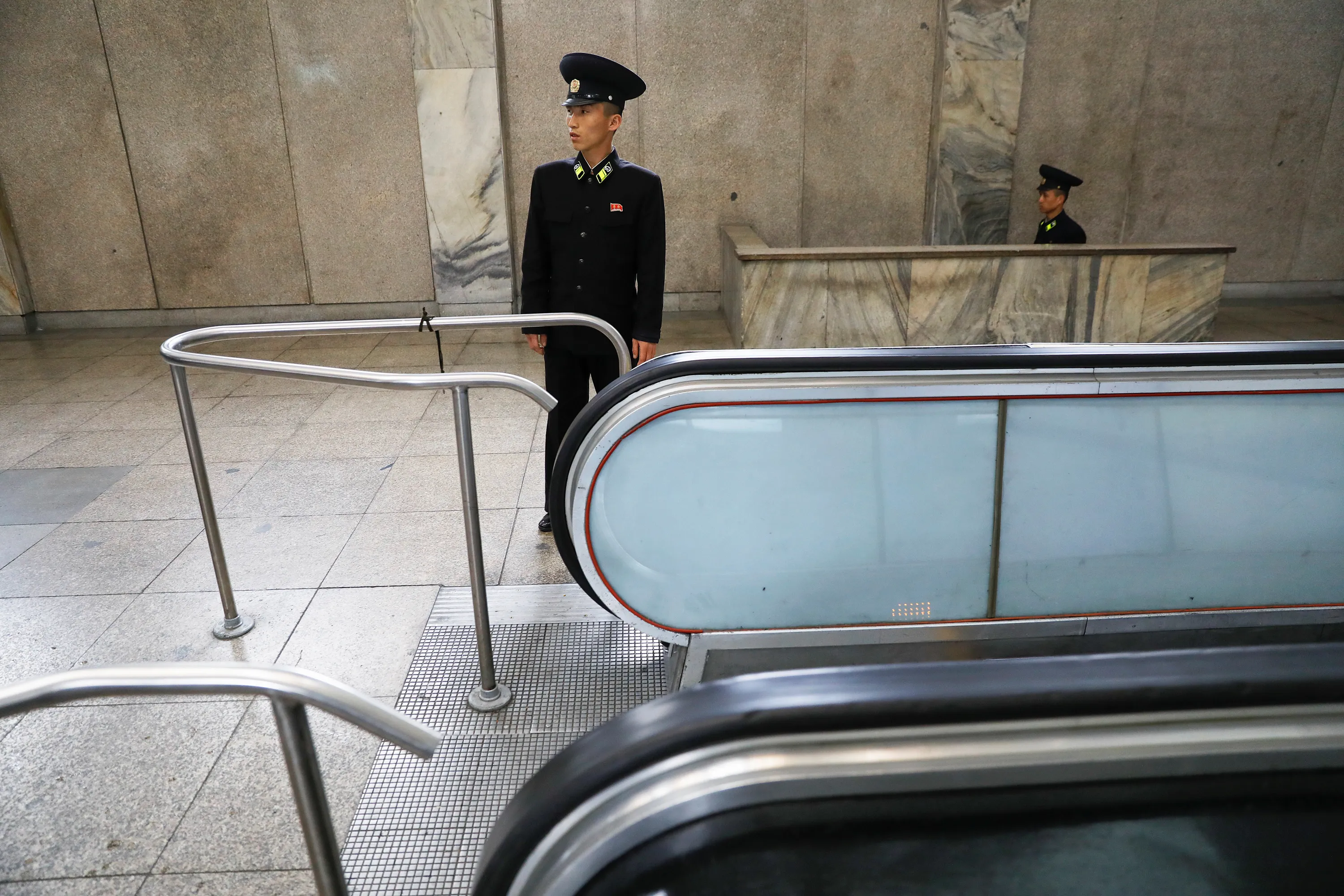 A railway worker stands by escalators at a subway station visited by foreign reporters, in central Pyongyang, North Korea on April 14, 2017. (Photo by Damir Sagolj/Reuters)