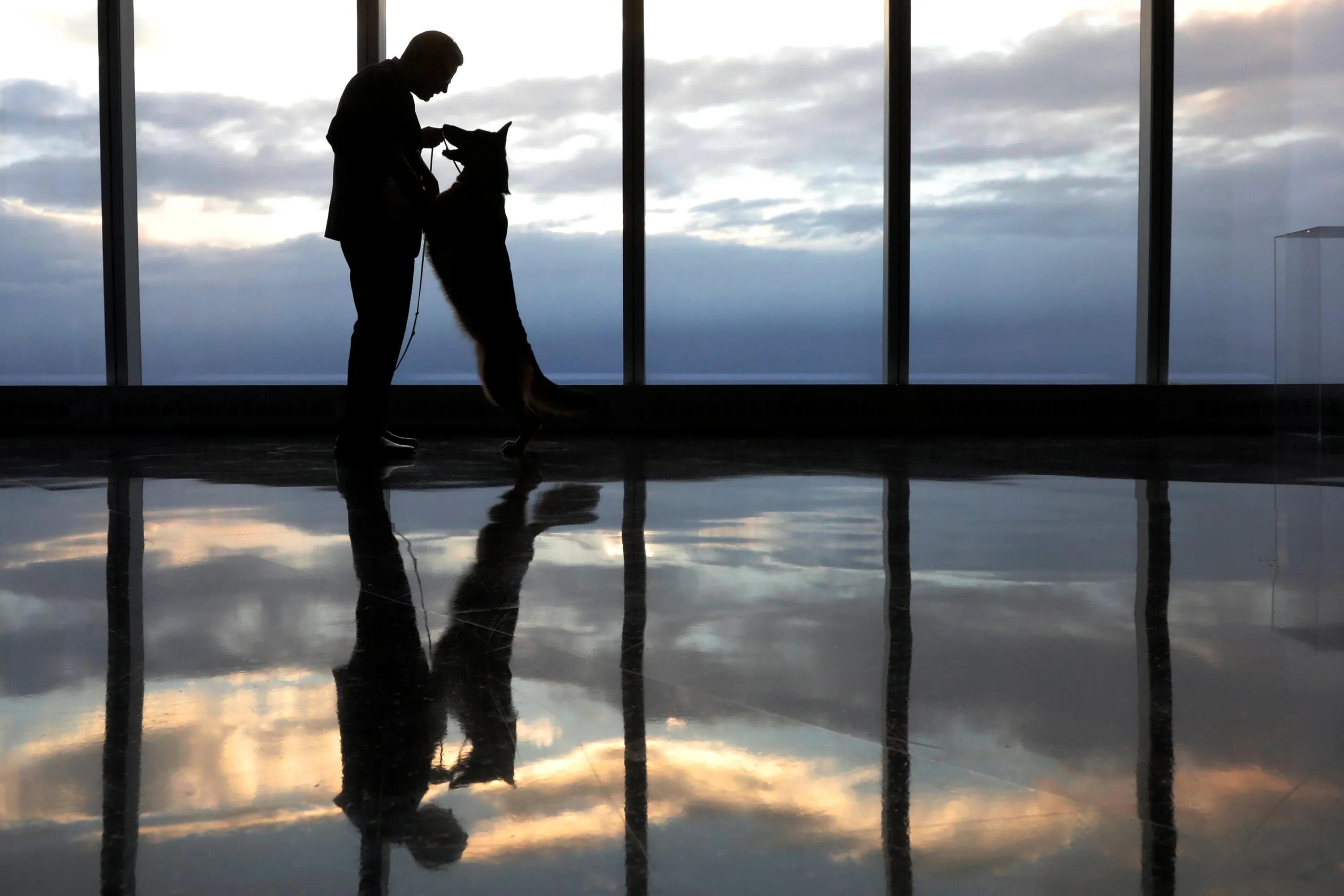 Rumor, a German shepherd and winner of Best In Show at the 141st Westminster Kennel Club Dog Show, accepts a treat from his handler, Kent Boyles during a visit to One World Observatory atop One World Trade Center in New York, U.S., February 15, 2017. (Photo by Brendan McDermid/Reuters)