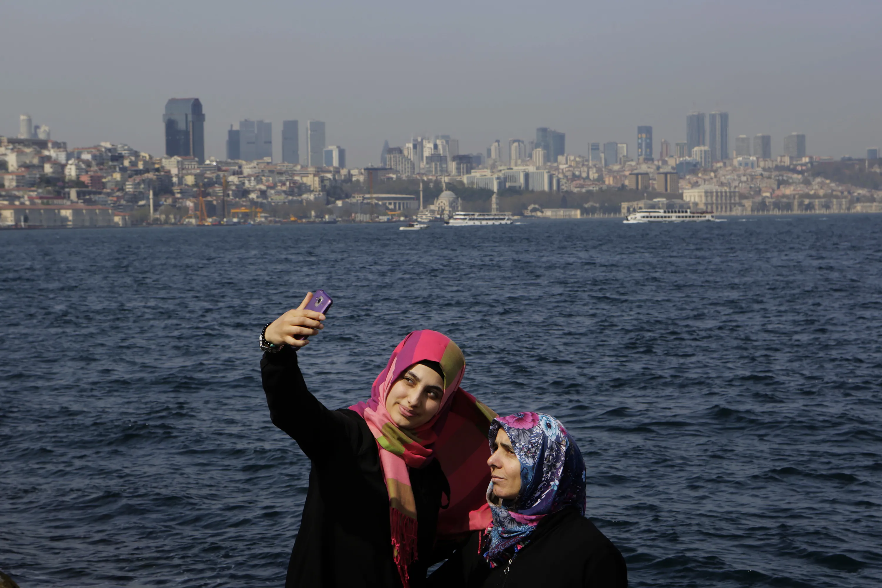 A mother and daughter take photos from a mobile phone as they enjoy the view of Bosphorus sea in Istanbul, Turkey, on Sunday, April 16, 2017. Turkish voters were casting their ballots Sunday in a historic referendum on whether to approve constitutional reforms that would greatly expand the powers of Erdogan. (Photo by Petros Karadjias/AP Photo)