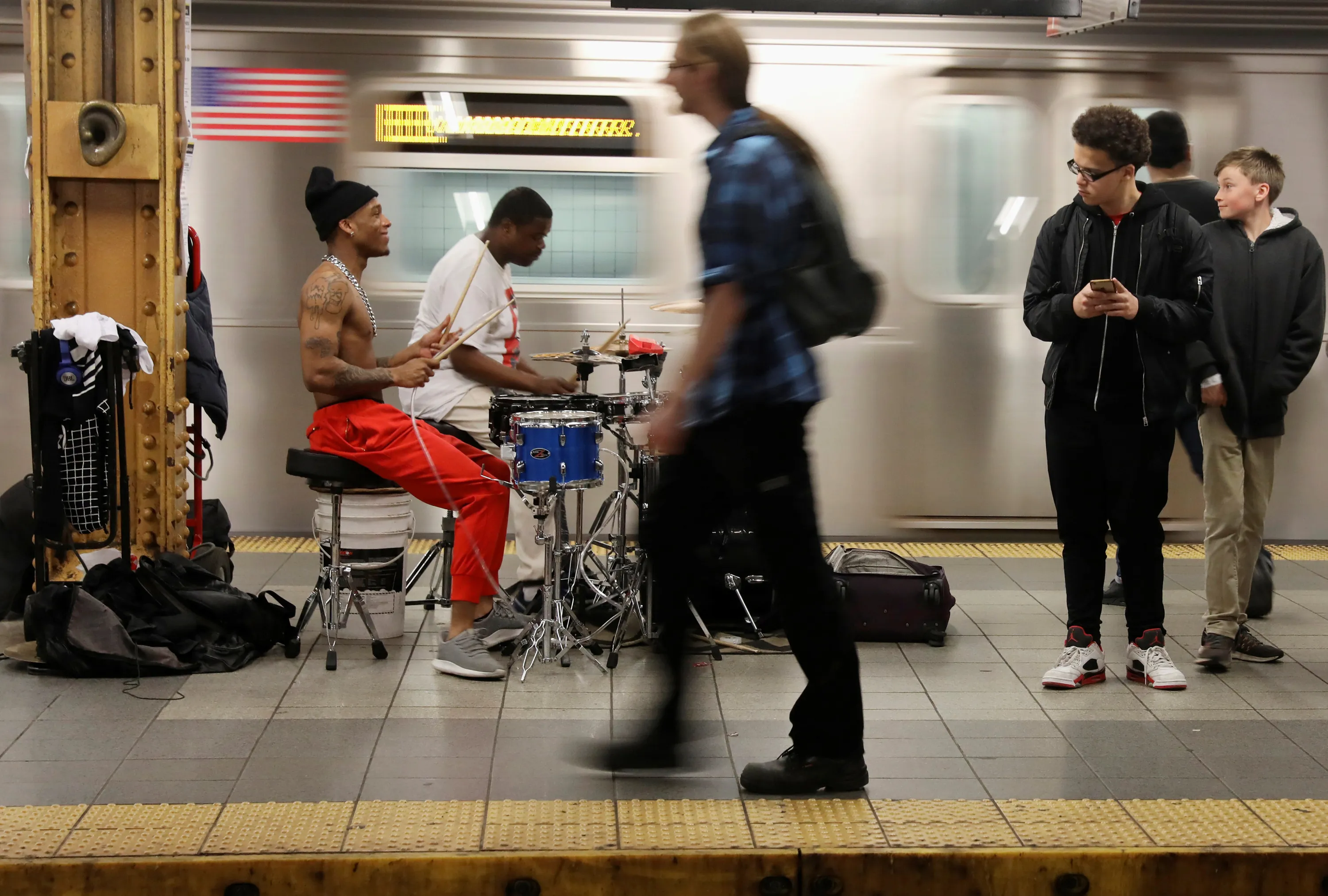 Men perform for tips on the subway platform in Manhattan, New York, U.S. April 20, 2017. (Photo by Shannon Stapleton/Reuters)