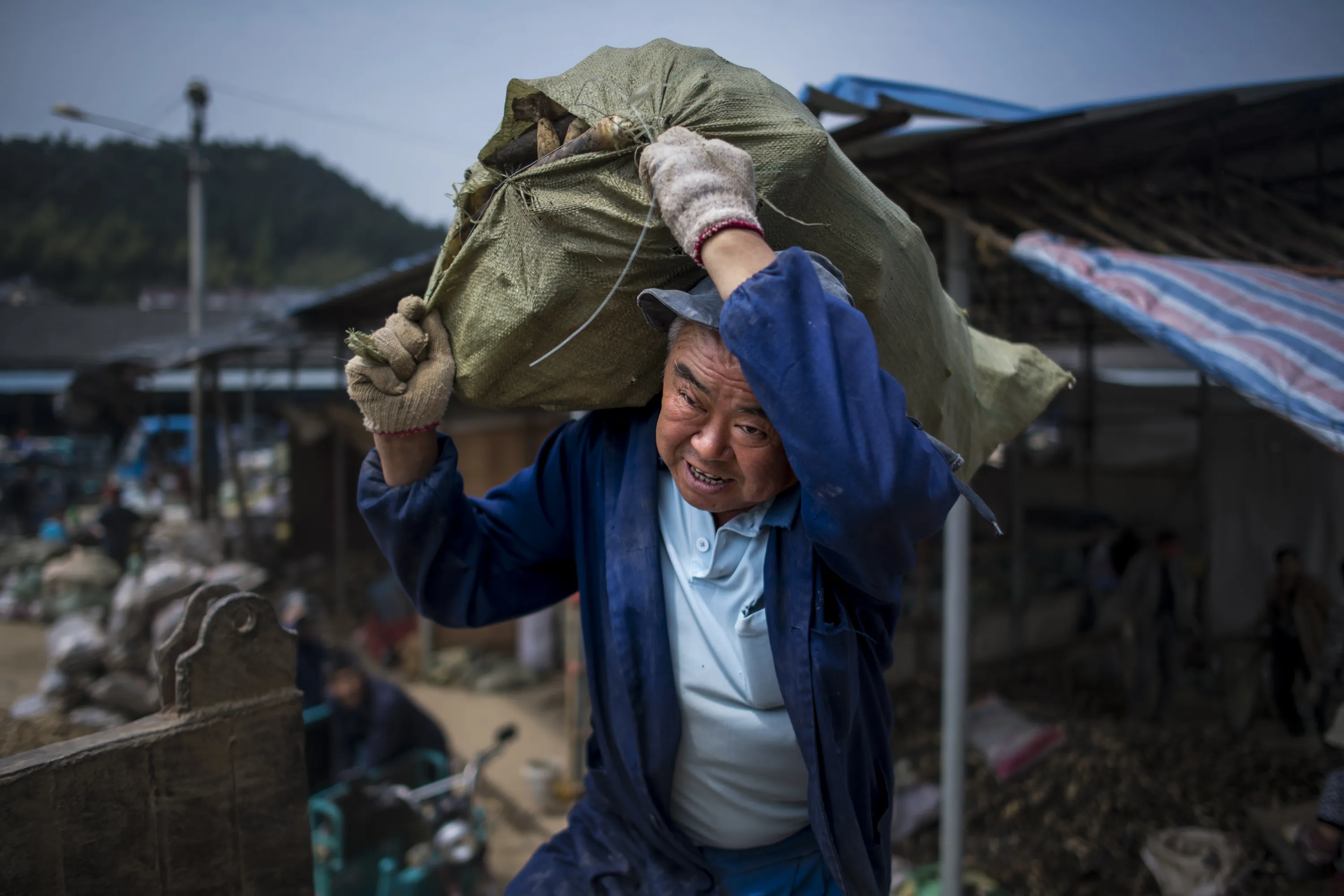 This picture taken on April 12, 2017 shows a man carrying a bag of bamboo shoots at a market in Taihuyuan village near the city of Lin'an, Zhejiang Province. (Photo by Johannes Eisele/AFP Photo)