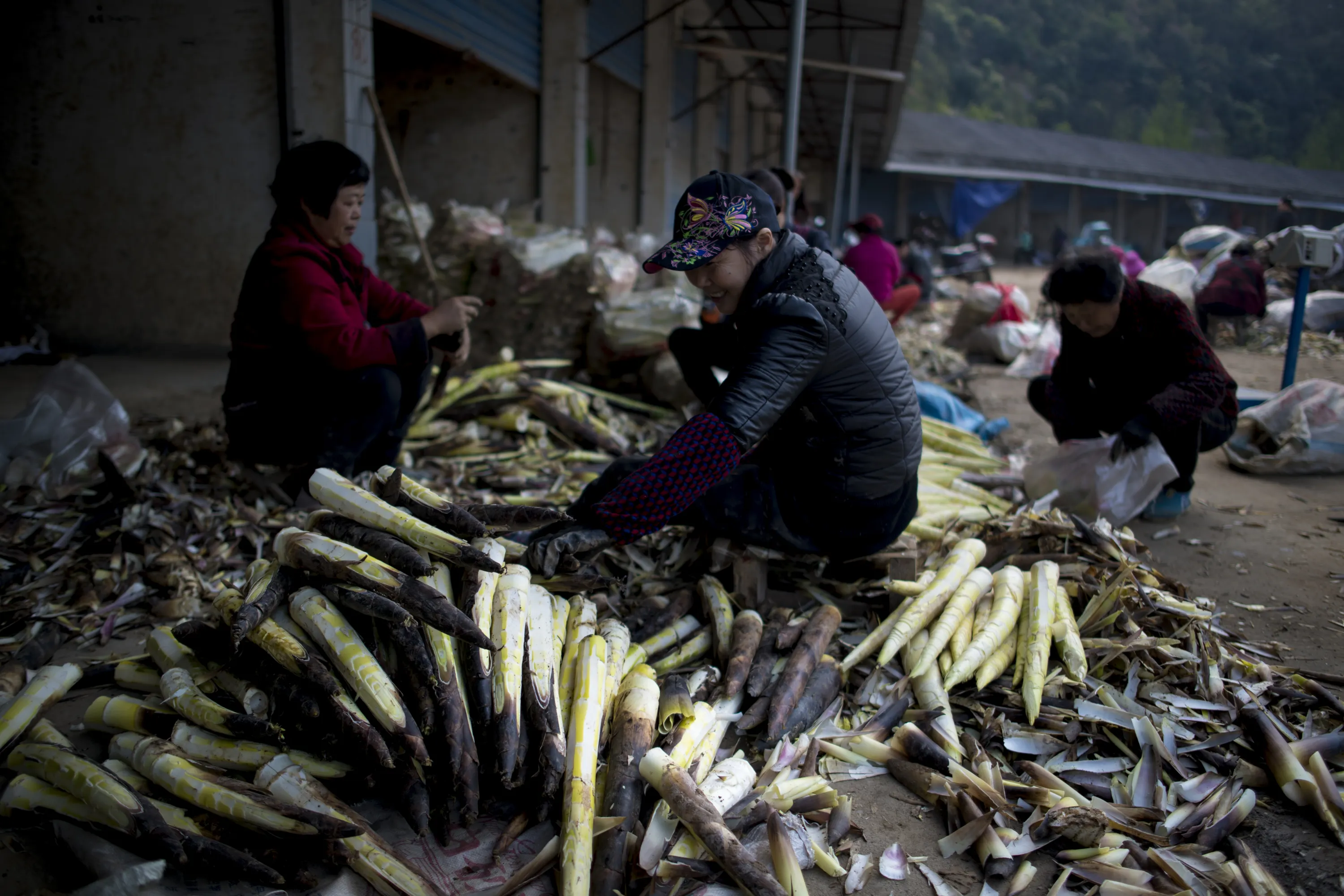 This picture taken on April 12, 2017 shows women cleaning bamboo shoots at a market in Taihuyuan near the city of Lin'an, Zhejiang Province. (Photo by Johannes Eisele/AFP Photo)