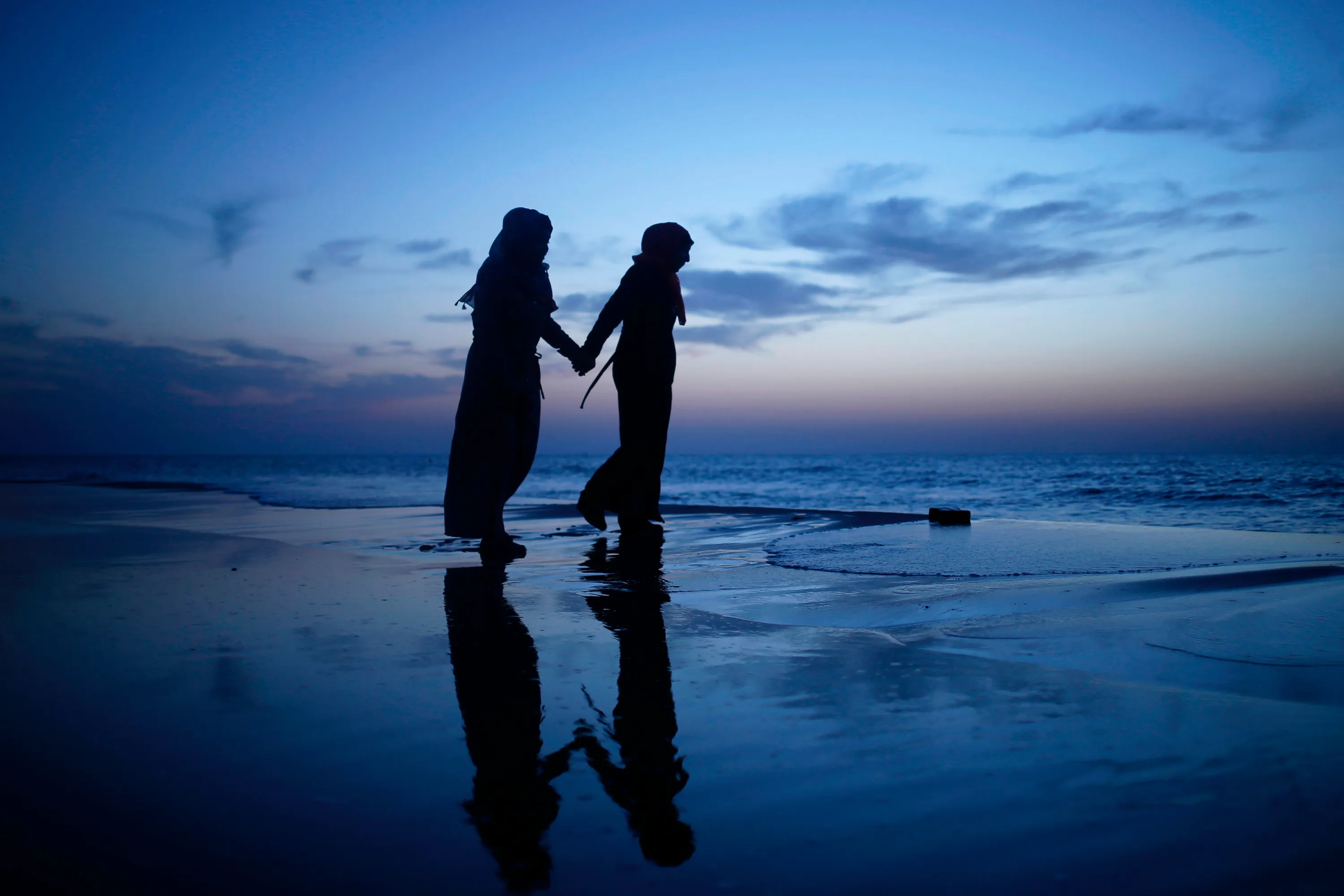 Palestinian girls walk holding hands at sunset on the beach in Gaza City as people around the world mark International Women' s Day on March 8, 2017. (Photo by Mohammed Abed/AFP Photo)