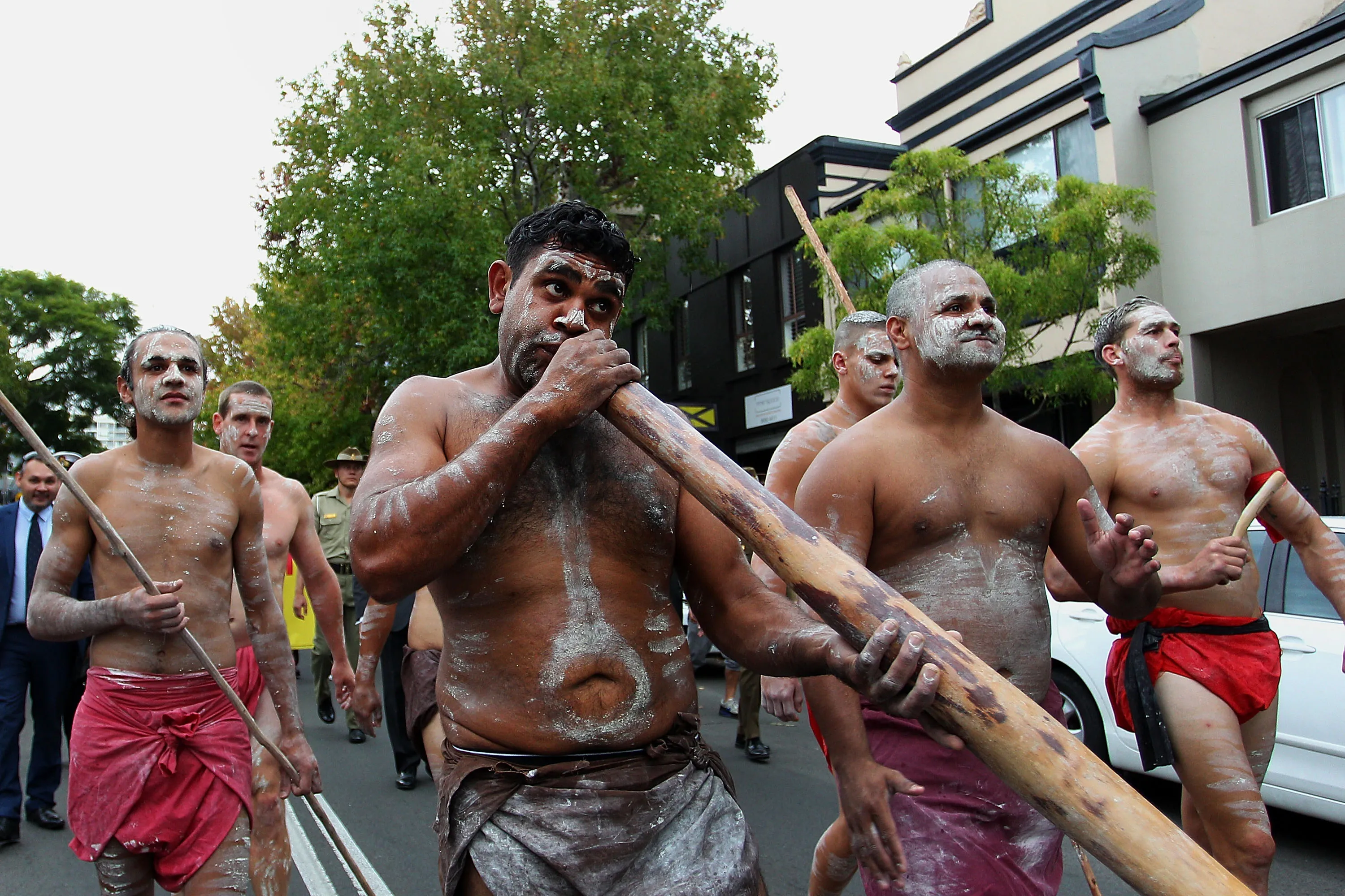 A indigenous man plays a didgeridoo as he leads the ANZAC march towards Redfern Park on April 25, 2017 in Sydney, Australia. The annual ANZAC coloured diggers event and march brings together the Indigenous and non-Indigenous community to celebrate the contributions of Aboriginal and Torres Strait Islander servicemen and servicewomen. (Photo by Lisa Maree Williams/Getty Images)
